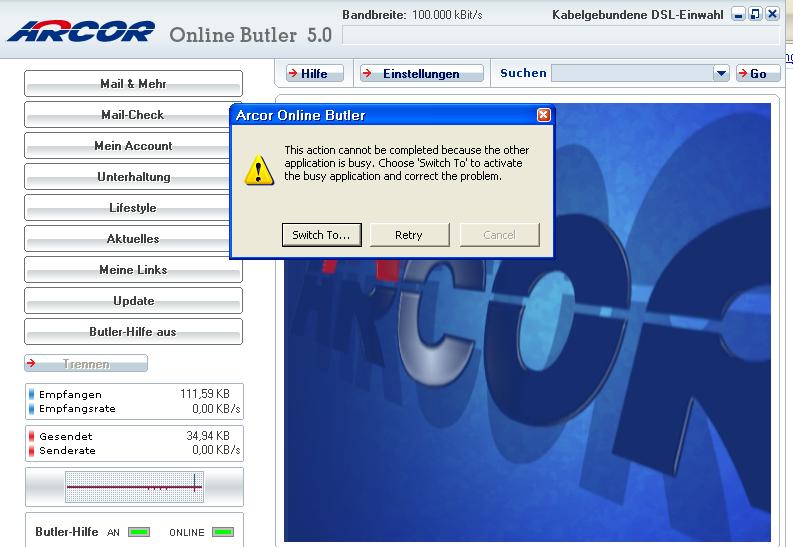 habe ein Problem mit dem Arcor Online butler.
