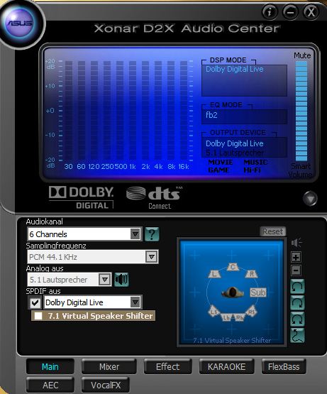 Hab sie eingebaut, Treiber von der CD installiert und im Xonar DX Audiocenter 5.1 eingestellt (wegen meinem 5.1 System) und der Fail ist, dass nur aus dem Center, Front Rechts und Links und Sub. Ton kommt. Die beiden Hinteren bleiben vollkommen stumm.