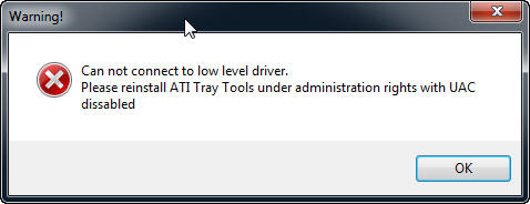 , worauf dann die weitere Programmausführung stoppt.Can not connect to low level driver. Please reinstall ATI Tray Tools under Administration rights with UAC dissabled