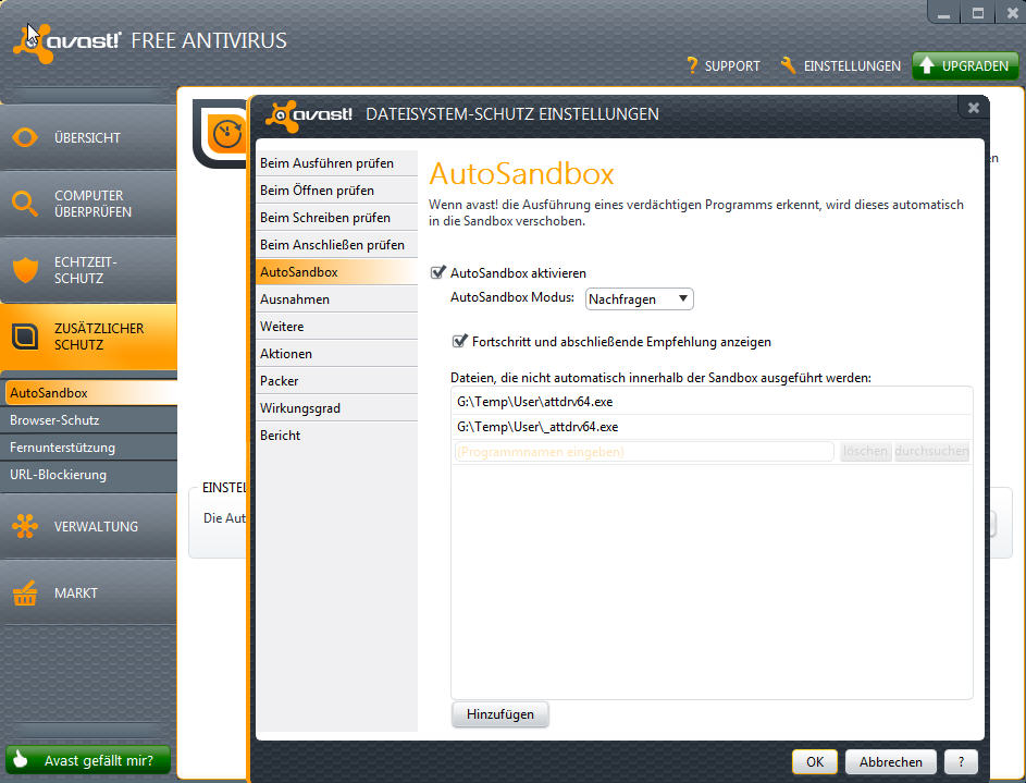 Die Lösung besteht darin, den AutoSandbox Modus von Avast von der Vorgabe "auto" auf "Nachfragen" zu stellen.