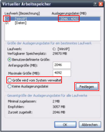 D.h. bei einem Laufwerk - muss nicht C: sein - sollte eine Auslagerungsdatei eingestellt sein; dort wo im Bild 2046 - 4092 steht (können bei dir andere Werte sein). Ist dort nirgends eine Auslagerungsdatei vorhanden, dann wähle am einfachsten Laufwerk C: und Größe wird vom System verwaltet und anschließend Festlegen.