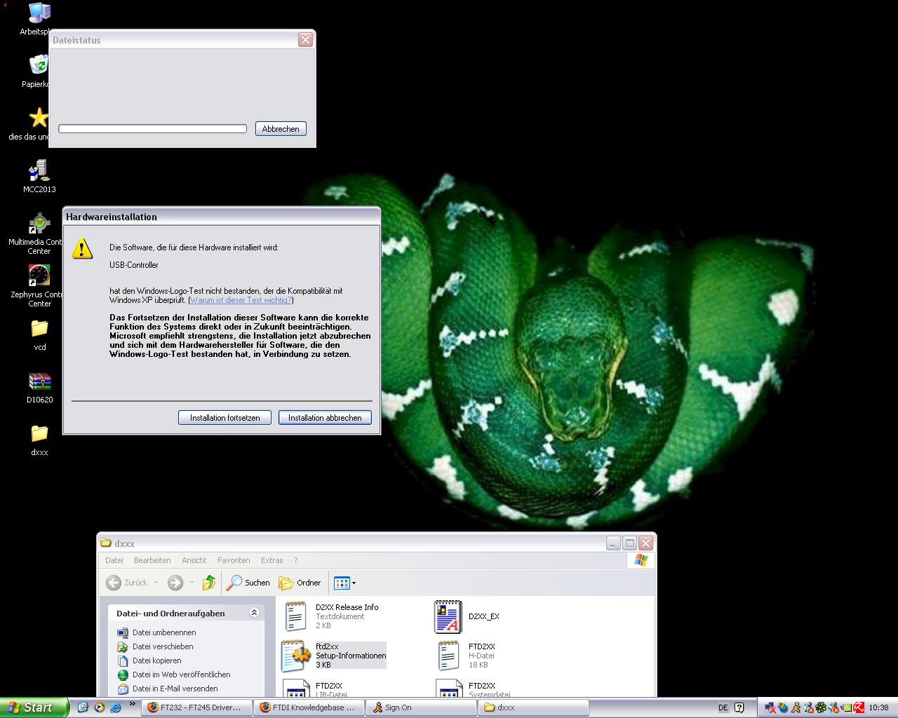 Auf der CD ist zwar eine USB Driver Software drauf, äber die lässt sich nicht installieren, bzw. es ist nur eine uninstall exe dabei, keine install.exe! Der Controller heißt FDTI xxxx laut Herstellerseite von FDTI gibt es keine richtigen Treiber für XP, das erknnet sich selber. Nur bei mir nicht! :(