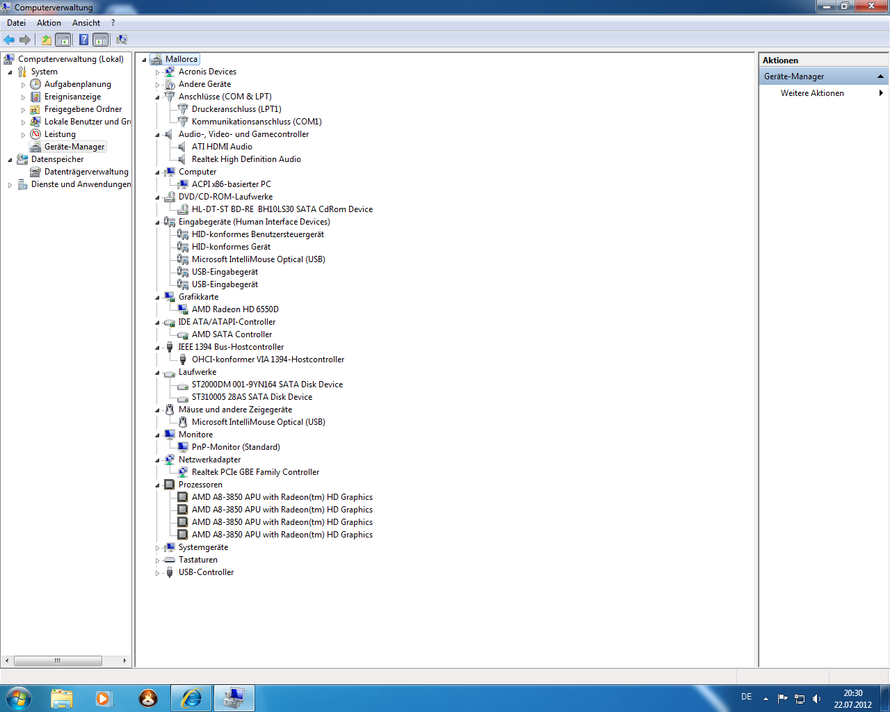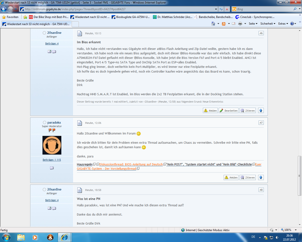 Das Mainboard ist auf AHCI eingestellt und Windows (x64 Ultimate) wurde in diesem Modus installiert. Als Chipsatztreiber habe ich sowohl die letzten offiziellen Trieber von AMD (12.4) versucht, als auch die von Gigabyte.