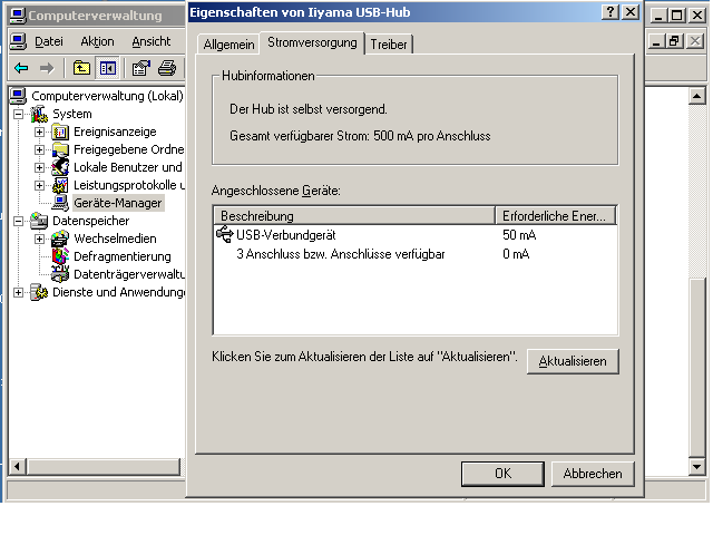 Win XP kann dir im Gerätemanager auch bei den USB-Hubs den Stromverbrauch der angeschlossenen Geräte anzeigen, das könntest Du auch mal kontrollieren.