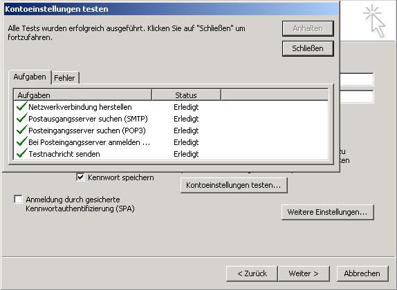 Mit der funktion Kontoeinstellungen testen werden laut Outlook keine fehler gefunden und alles erledigt.