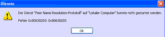 Nach ein paar Nachforschungen bin ich auf die vermeintliche Ursache gestoßen. Der PNRPSvc Dienst kann auf dem betreffenden Rechner nicht gestartet werden. Nach mehreren Versuchen mittels winsock reset und Deinstallation des Protokolls über die Windows-Komponenten -> Netzdienste stehe ich immernoch vor folgendem Fehler beim Versuch den Dienst zu starten (siehe Anhang).