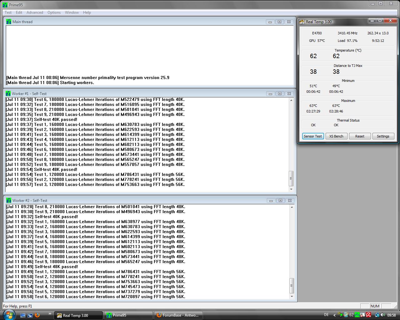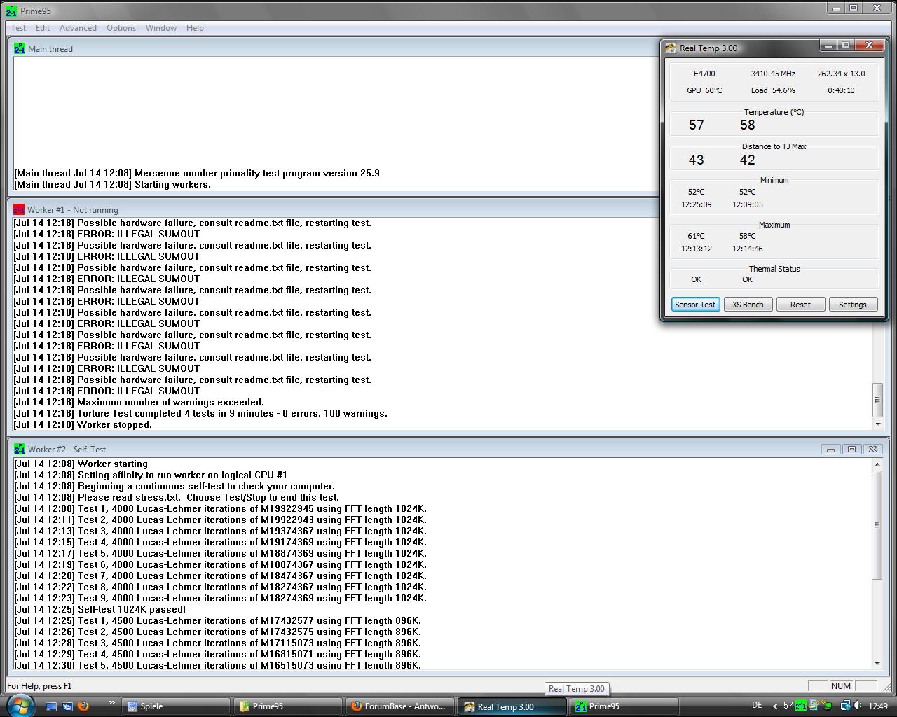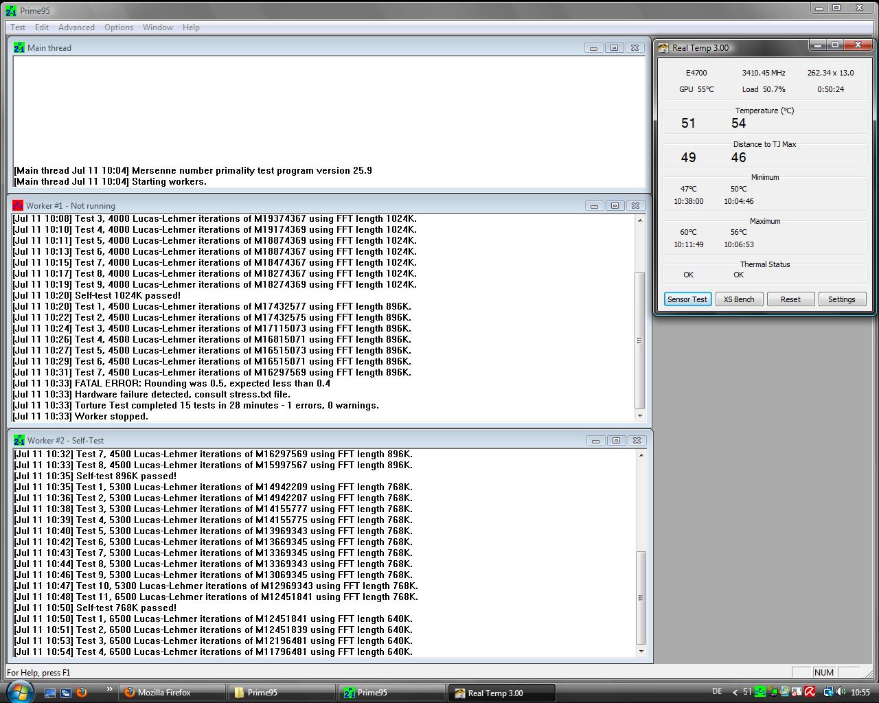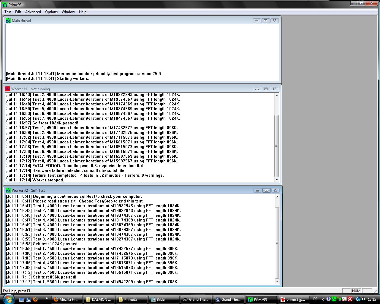 Ich wollte Prime95 nochmals durchlaufen, um zu checken ob alles i.O. ist. Doch es ist schon drei mal bei minute 50-55 abgestürtzt (Keine Rückmeldung).