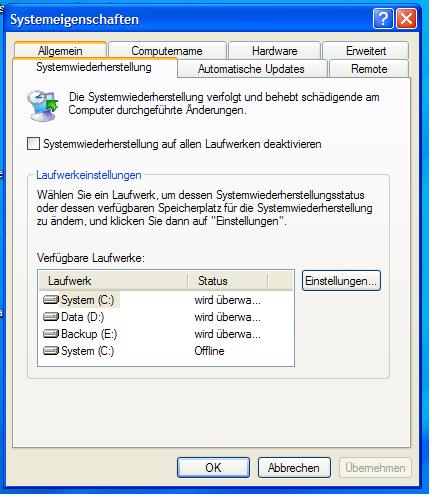 Denn wenn ich jetzt auf einen früheren Zeitpunkt wiederherstellen möchte, bekomme ich immer die Fehlermeldung das Laufwerk C nicht überwacht wird, und somit nicht wieder hergestellt werden kann. Aber mein richtiges C wird überwacht.