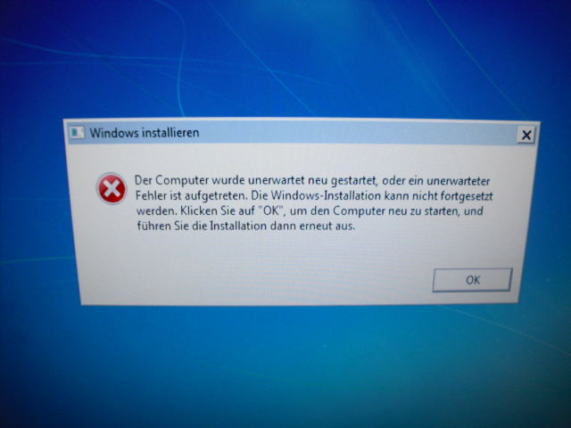 Dann kommt nun jedes mal eine Fehlermeldung, dass ein unerwarteter Fehler aufgetreten sei und die Installation deshalb nicht abgeschlossen werden könne. (Siehe auch Anhang)