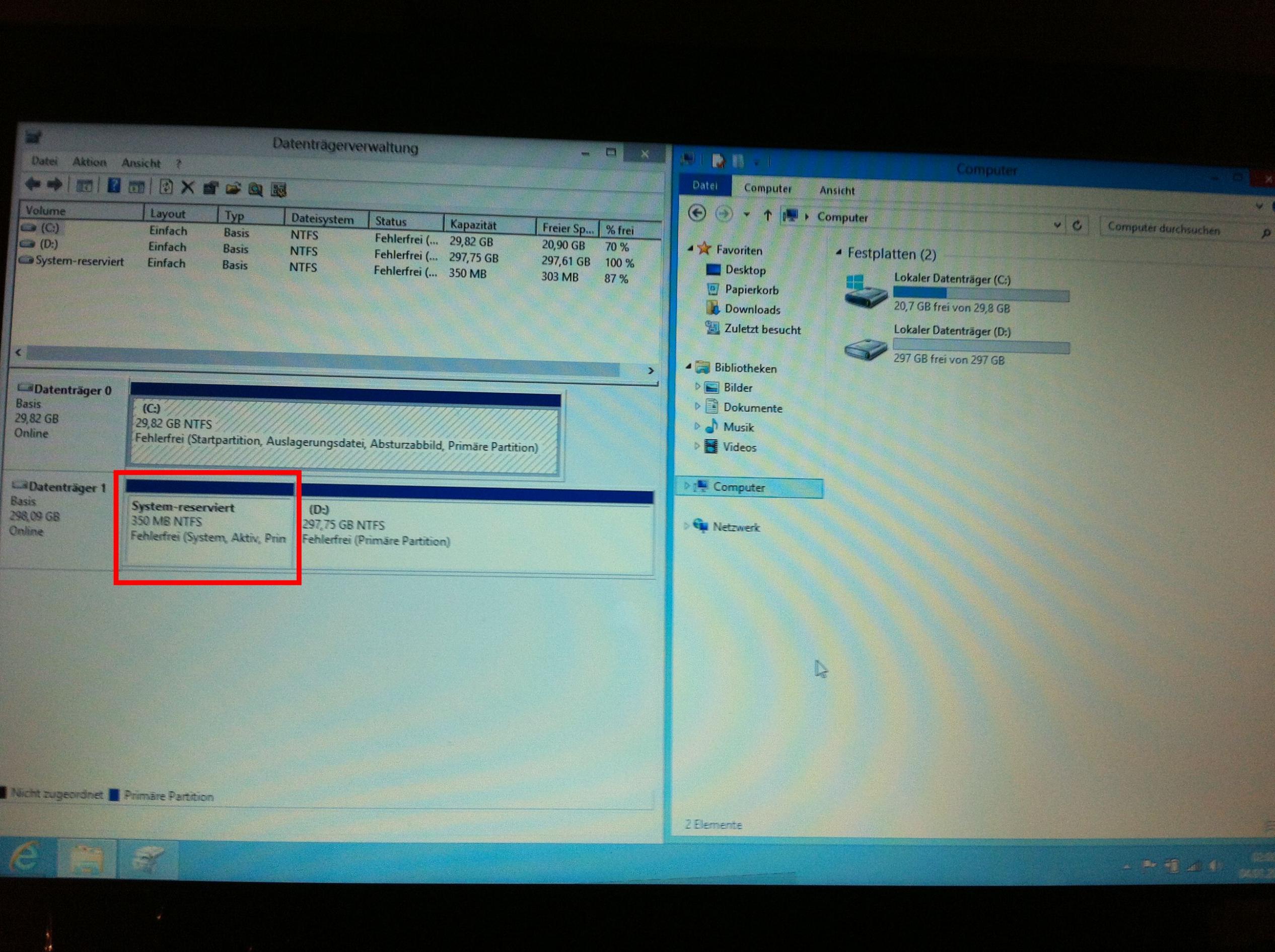 Windows 7 Home Premium ist bereits vorinstalliert, aber mit jeder Menge Software und Testversionen zugemüllt. Außerdem sind die Festplatten für meine Begriffe sehr seltsam partitioniert, es gibt insgesamt sechs Partitionen, darunter eine Ruhezustandspartition mit 8 GB. (Falls jemand ne Ahnung hat, was diese eigenartige Partitionierung soll, würde ich mich über eine Erklärung freuen.)