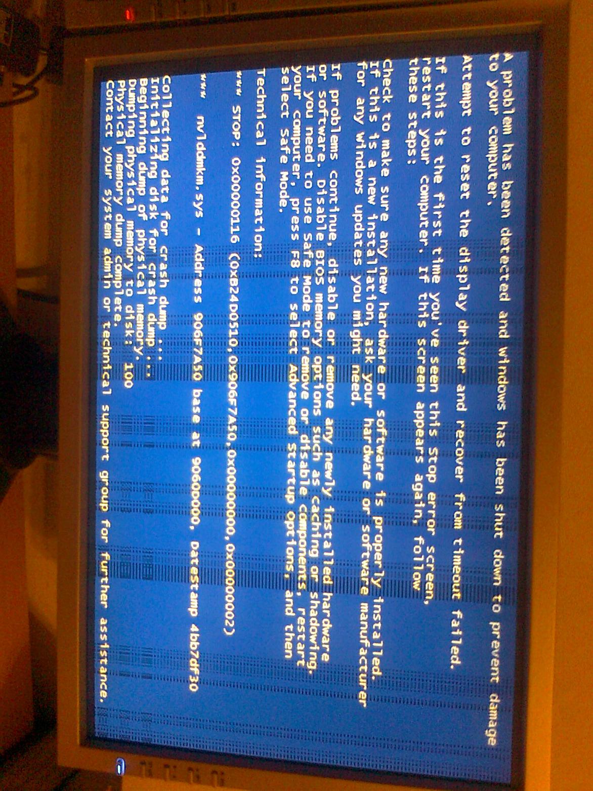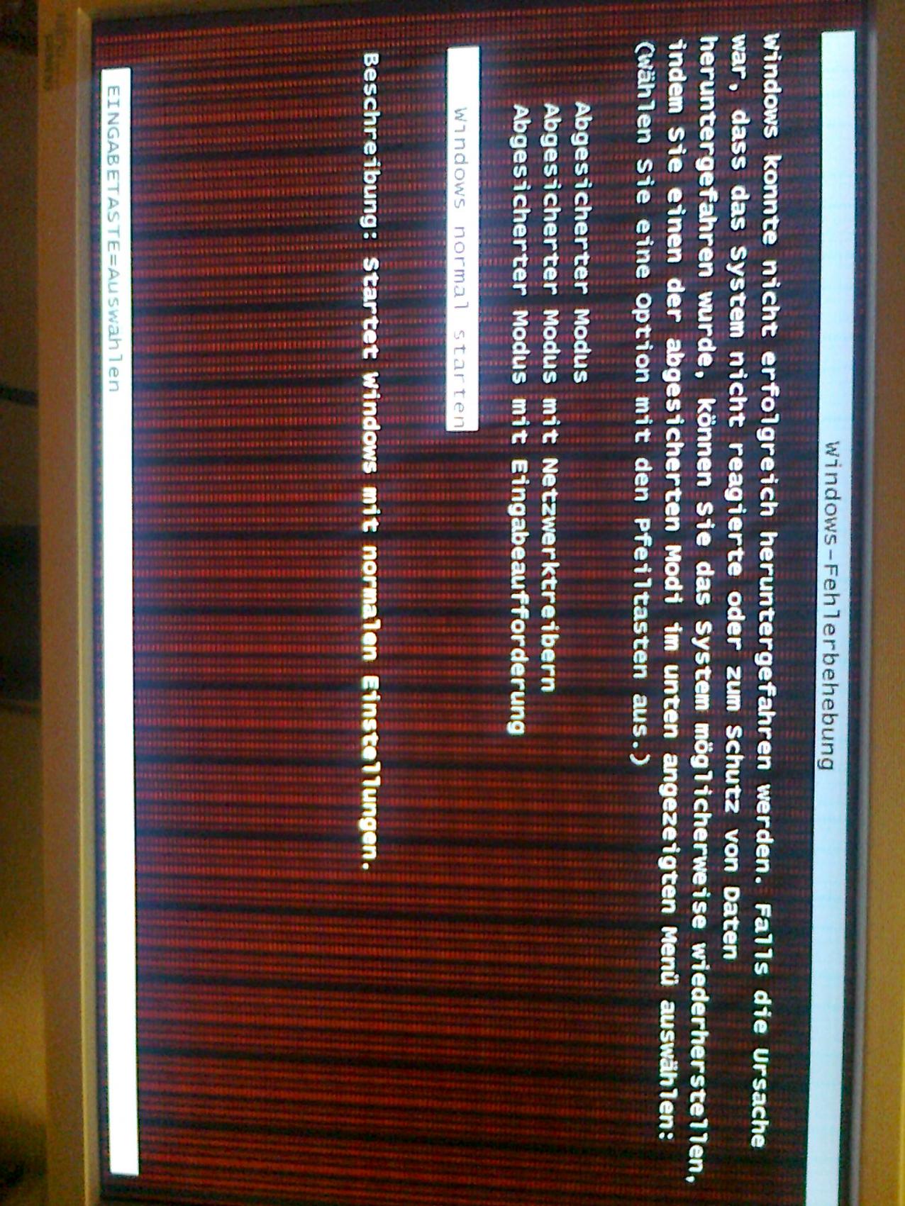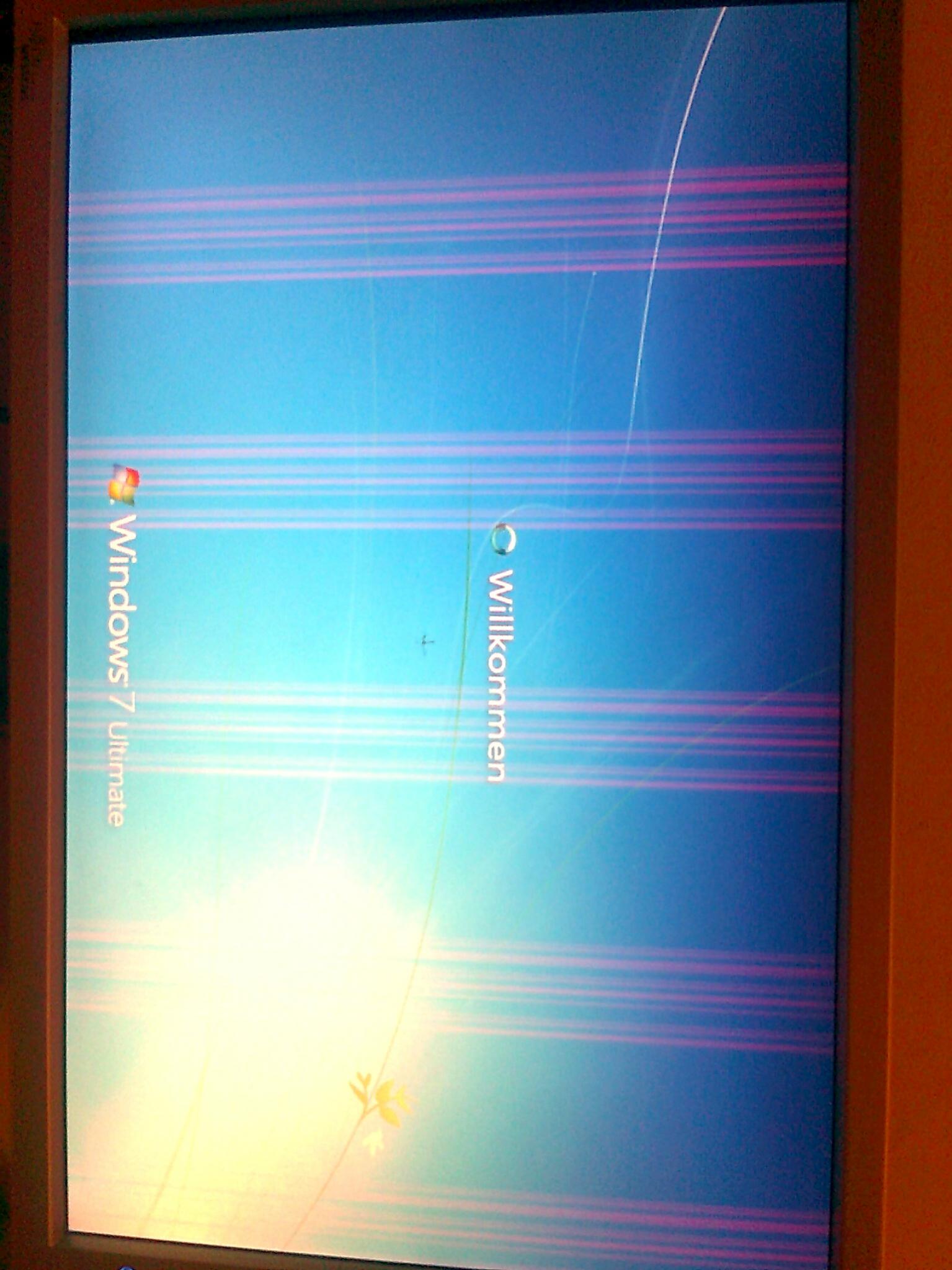 Gestern Abend mitten im Betrieb (habe was mit Excel gemacht) fangen meine 2 Bildschirme plötzlich an komische Muster und Streifen darzustellen - mit dem Ergebniss, dass win7 eingefroren ist. Ich habe mir halt gedacht "Microsoft..." also einfach mal Stecker gezogen und neu gestartet. Doch bereits während des Bottvorganges, also wenn das Logo des MB-Herstellers erscheint, sind Streifen von unterschiedlichster Farbe auf dem Bildschirm. Diese Fehler wechseln dann beim Bootmenü und beim Startvorgang (ich stell noch Bilder rein..). Ich hab mal nen anderen PC an die Bildschirme angeschlossen - sie sind aufjedenfall in Ordnung.