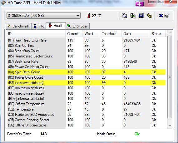 merkwürdigerweise habe ich ein ständiges nervendes Geräusch welches von der Festplatte kommt. Es hört sich an wie Tick Tack Tick Tack Tick Tack... und kommt genau 2x pro Sekunde. Es leuchtet jedoch keine IDE-LED. Wie kann ich prüfen ob die Festplatte irgendwelche abfragen macht/Anfragen bekommt oder ist sie defekt? Sidn die Werte überhaupt in Ordnung?