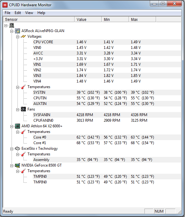 Habe vorhin den PC mal aufgeschraubt und bisschen "staubgesaugt" (es war kaum Staub), danach lief er auch etwas länger als die Male davor (ca. 5-8min), aber kann natürlich nicht lösung sein. Daher habe ich direkt HWMonitor runtergeladen. Die Temperaturen kannst du dem Screenshot entnehmen.simpel1970 schrieb:Wie sieht es erst mal mit der CPU-Temperatur aus?