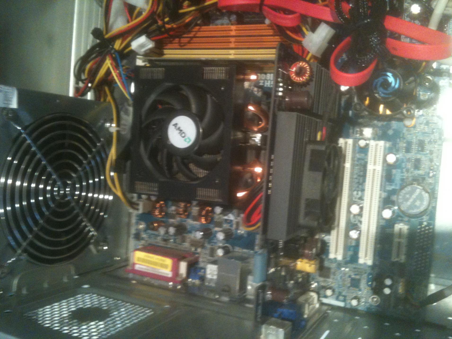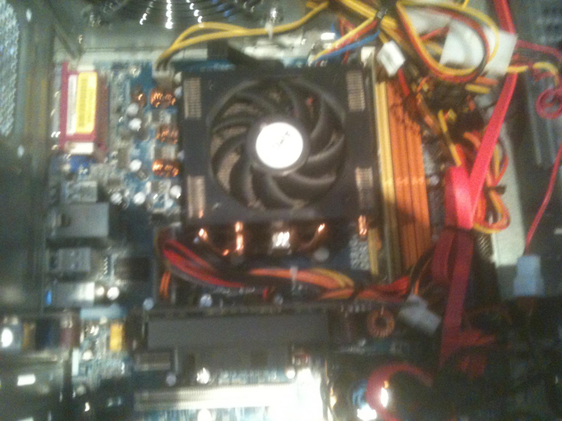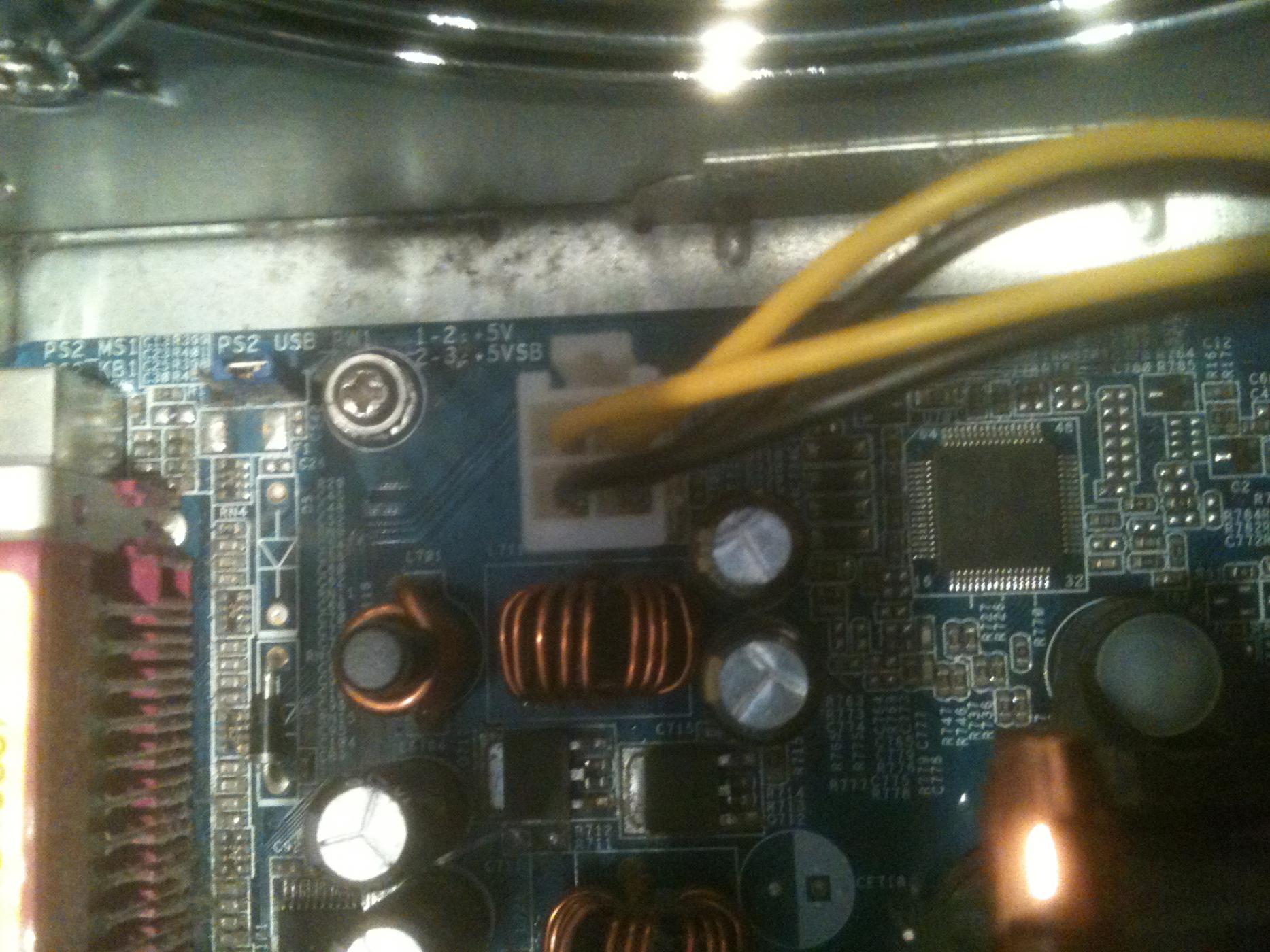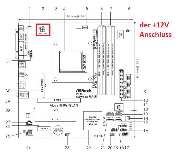 Deshalb gib noch Angaben zum Netzteil ... und wie das Netzteil mit dem Board verbunden wurde ? Ist auch der +12V Anschluss mit dem Board korrekt verbunden ? Hat der Netzteil +12V Anschluss mehr als die 4 Pins ? Ich suche den +12V Anschluss noch aus dem Mainboardbuch und poste das Bild dann. Kannst du von deinem Board mal ein Bild machen und posten ?
