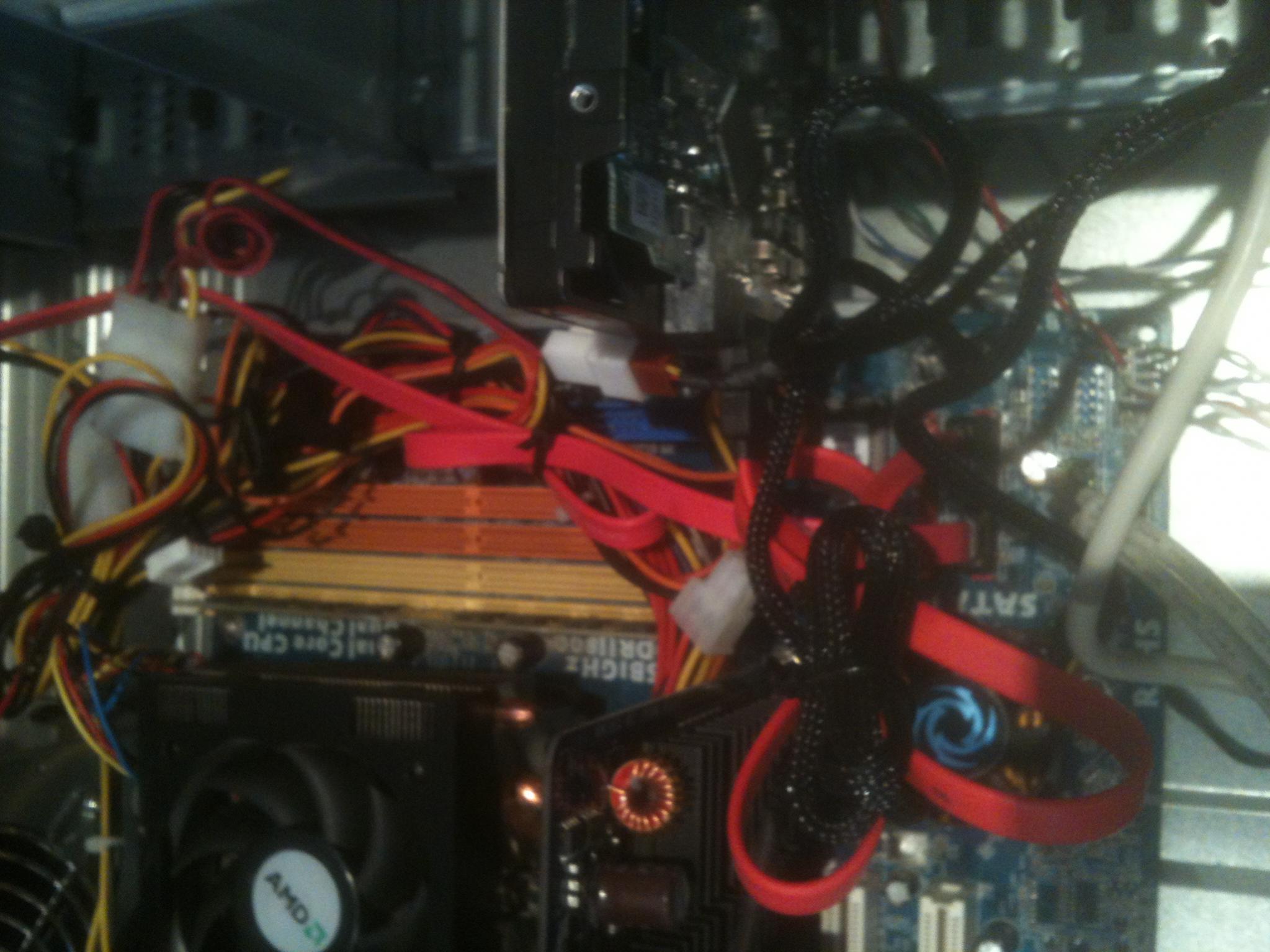 Vor Eingriff NETSTECKER ziehen und die POWER TASTE kurz drücken (damit restlicher Strom entweicht), anschließend mit den Händen an Heizkörper fassen , dann ins Mainboard.