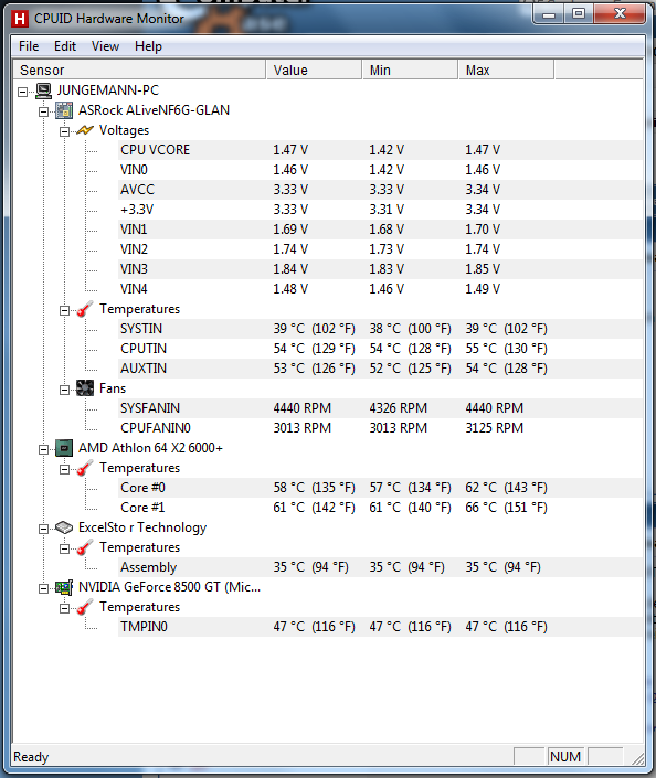 Habe gerade den PC gestartet. Dann ging er nach 5 minuten aus. Nach dem Neustart habe ich ein Screenshot von den Temps gemacht.