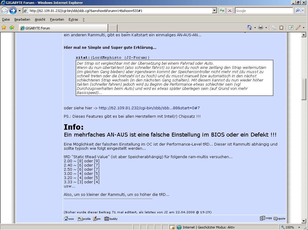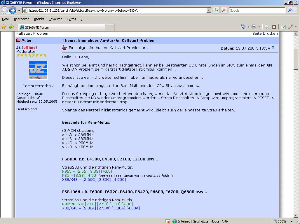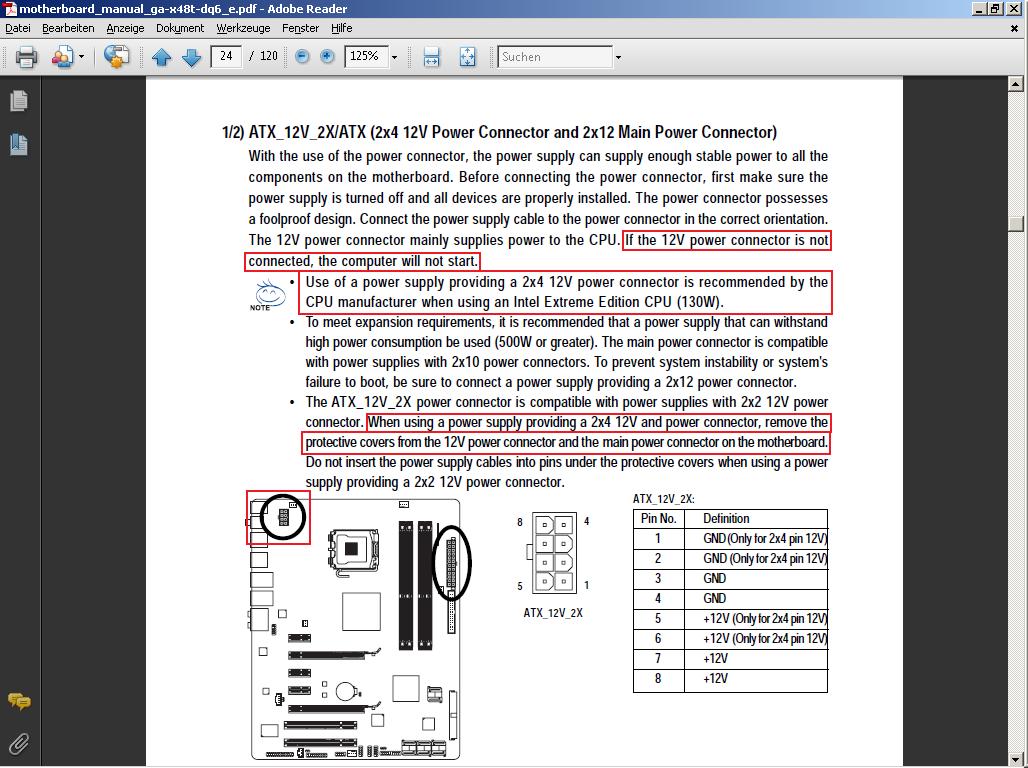 Ich versuche momentan mein Gigabyte X48T-DQ6 mit einem Zalman CNP 9700NT zum laufen zu bringen aber der Lüfter streikt. Er springt kurz an und bleibt dann stehen. Gehäuselüfter und Grafikkarte laufen ganz normal an. Das Netzteil (Enermax Galaxy 850W) piepst dann. Hat jemand eine Idee woran das liegen könnte oder hat selbst mal mit dieser Kombination Probleme gehabt?