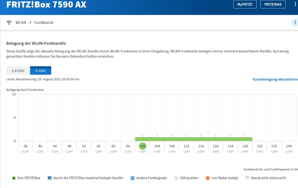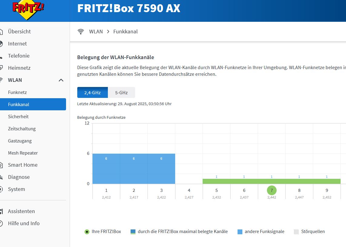 12.09.25 07:12:50 WLAN-Autokanal: Die Kanaleinstellungen (vorher Kanal 7 (Frequenz 2.442 GHz)) wurden