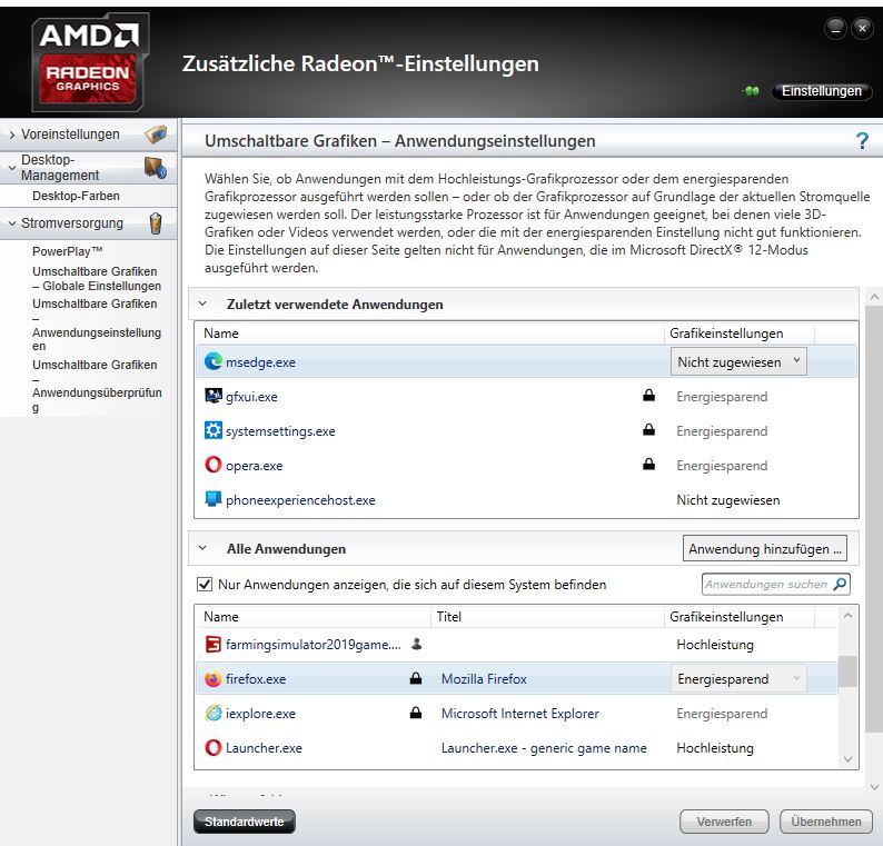 Frage 2: Wie kann ich denn Einstellen, dass mein Browser Firefox, in dem ich die Youtubevideos ja schaue, mit der AMD Grafikkarte läuft und nicht mir der internen Intel ? Man kann zwar die Grafikkarte bei ausgewählten Programmen zuordnen, aber beim Browser ist ein Schloss dran, da kann ich nichts ändern.