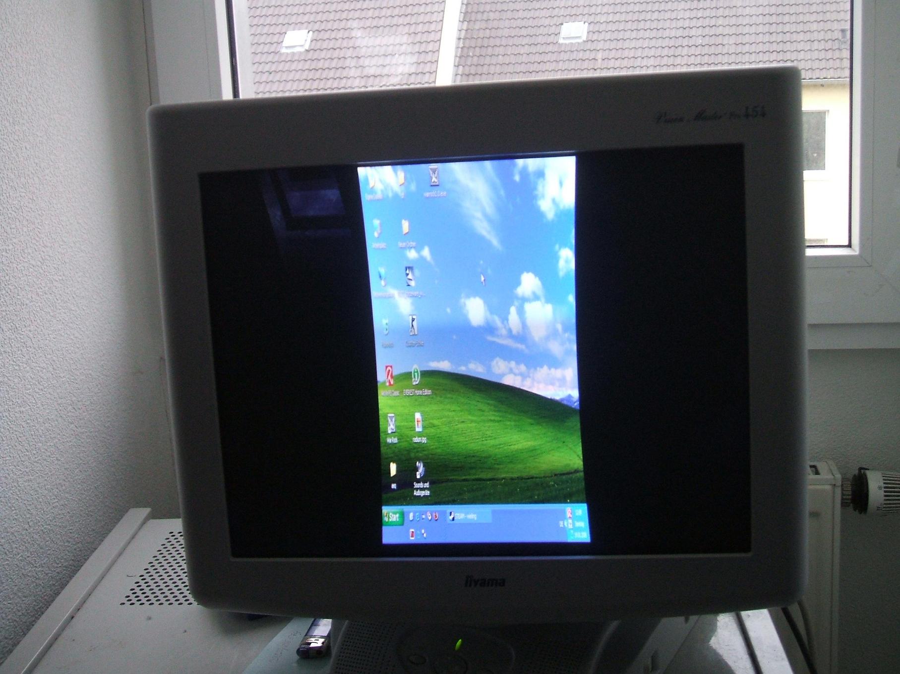 Das Angezeigte Bild befindet sich lediglich in der Mitte des Monitors. Die linke sowie die rechte Hälfte bleiben schwarz (Siehe Foto). Auch mit den verschiedenen Monitoreinstellungen (horizontale verzerrung) lässt sich das problem nicht beheben.