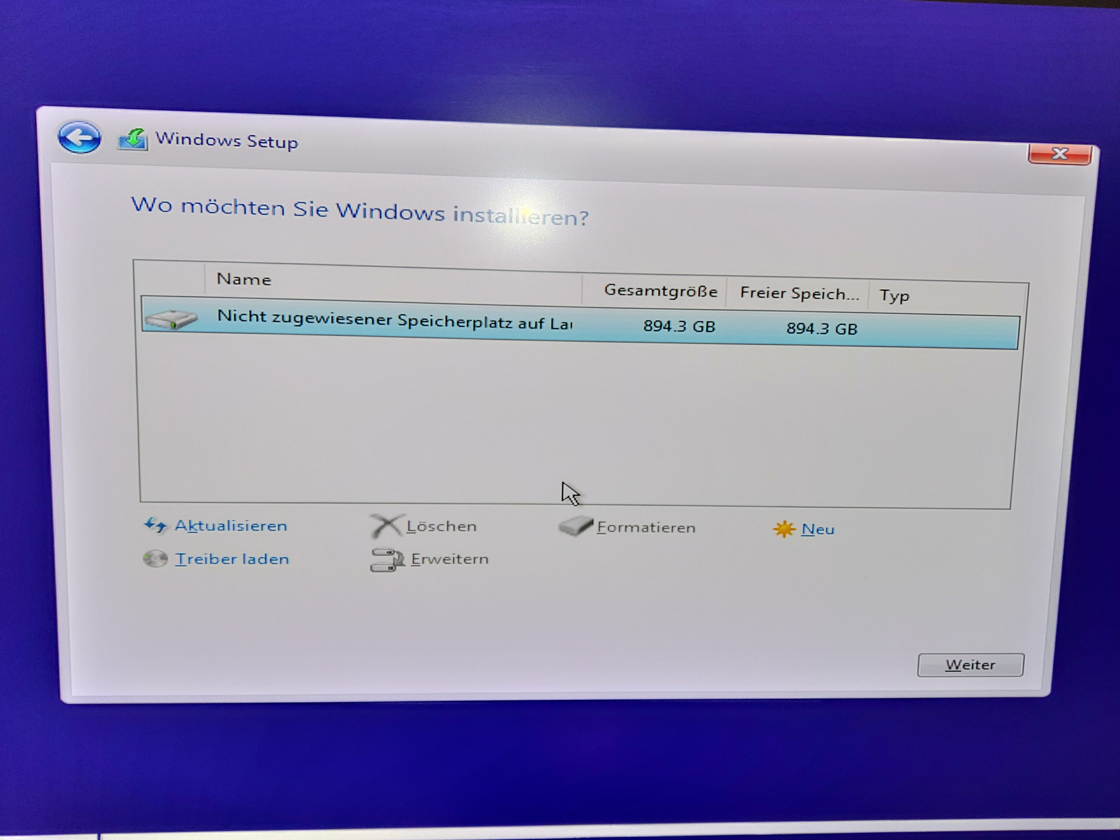 alle Partitionen löschen, nicht selbst formatieren einfach weiter.