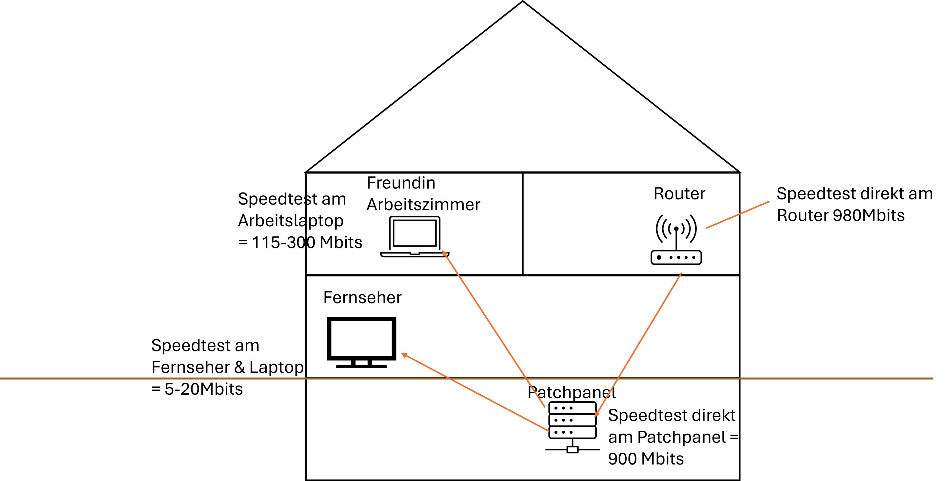 - Ich habe, um dem Verdacht, dass in den Wänden nur <CAT 5-Kabel gelegt wurden, entgegenzukommen einen Speedtest direkt am Patch Panel gemacht (Es kommen 900 Mbits an)