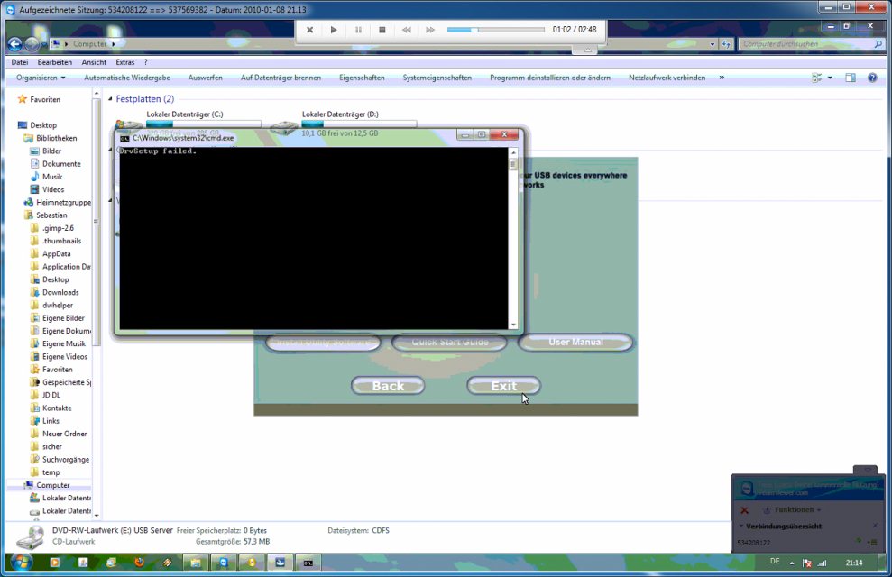 Vor dem Abschluss der Installation öffnet sich ein DOS-Fenster, in dessen Befehlszeile man kurzfristig folgenden Hinweis sieht: "DrvSetup failed.".