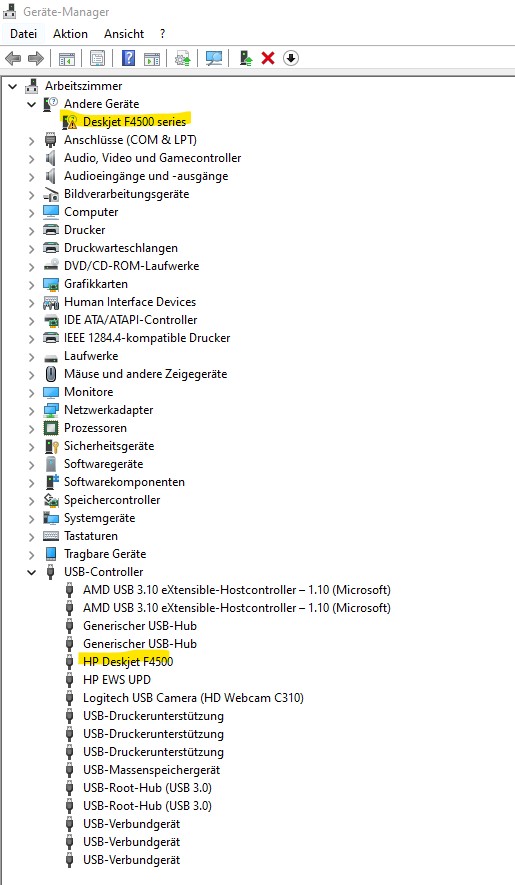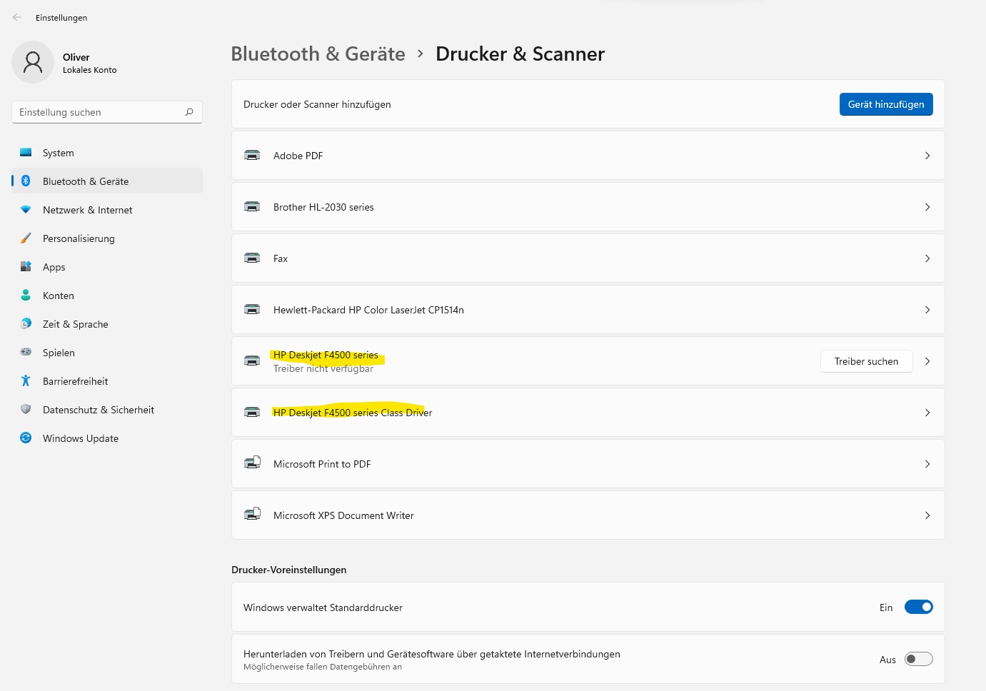 Daher habe ich den Drucke jetzt an meinen eigentlichen Arbeits-Rechner unter Win11 über USB angeschlossen. Komischwerweise erscheint dieser im Geräte-Manager sowie unter Drucker und Scanner gleich 2x. Ist hilft auch nur kurzzeitig, wenn ich den (fehlenhaften) Eintrag im Geräte-Manager deinstalliere bzw. unter Drucker und Scanner den Drucker ohne Treiber entferne.