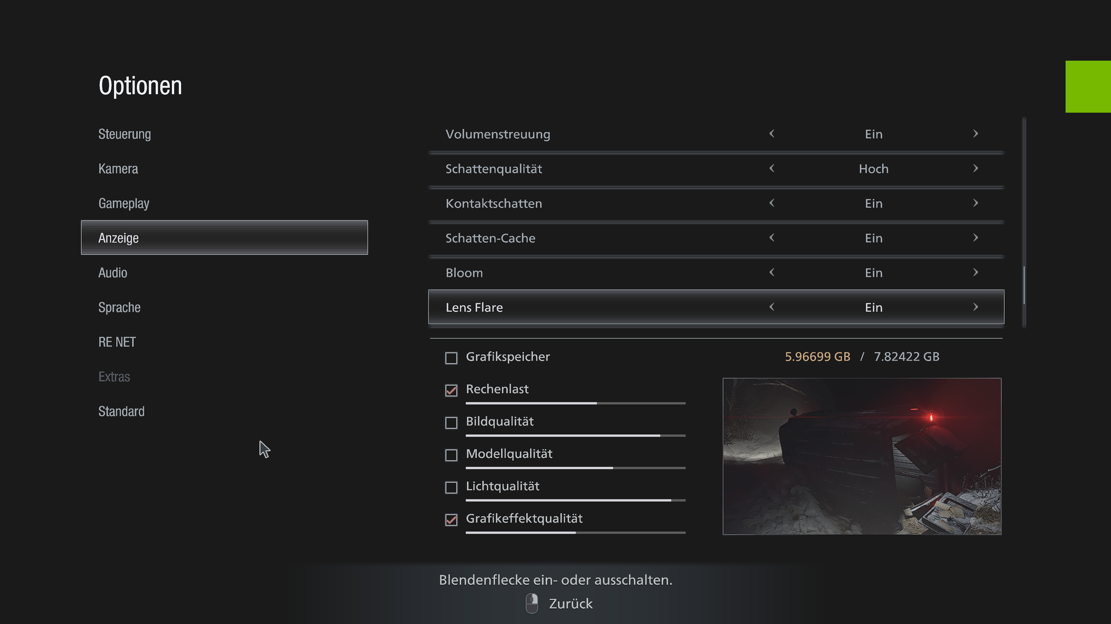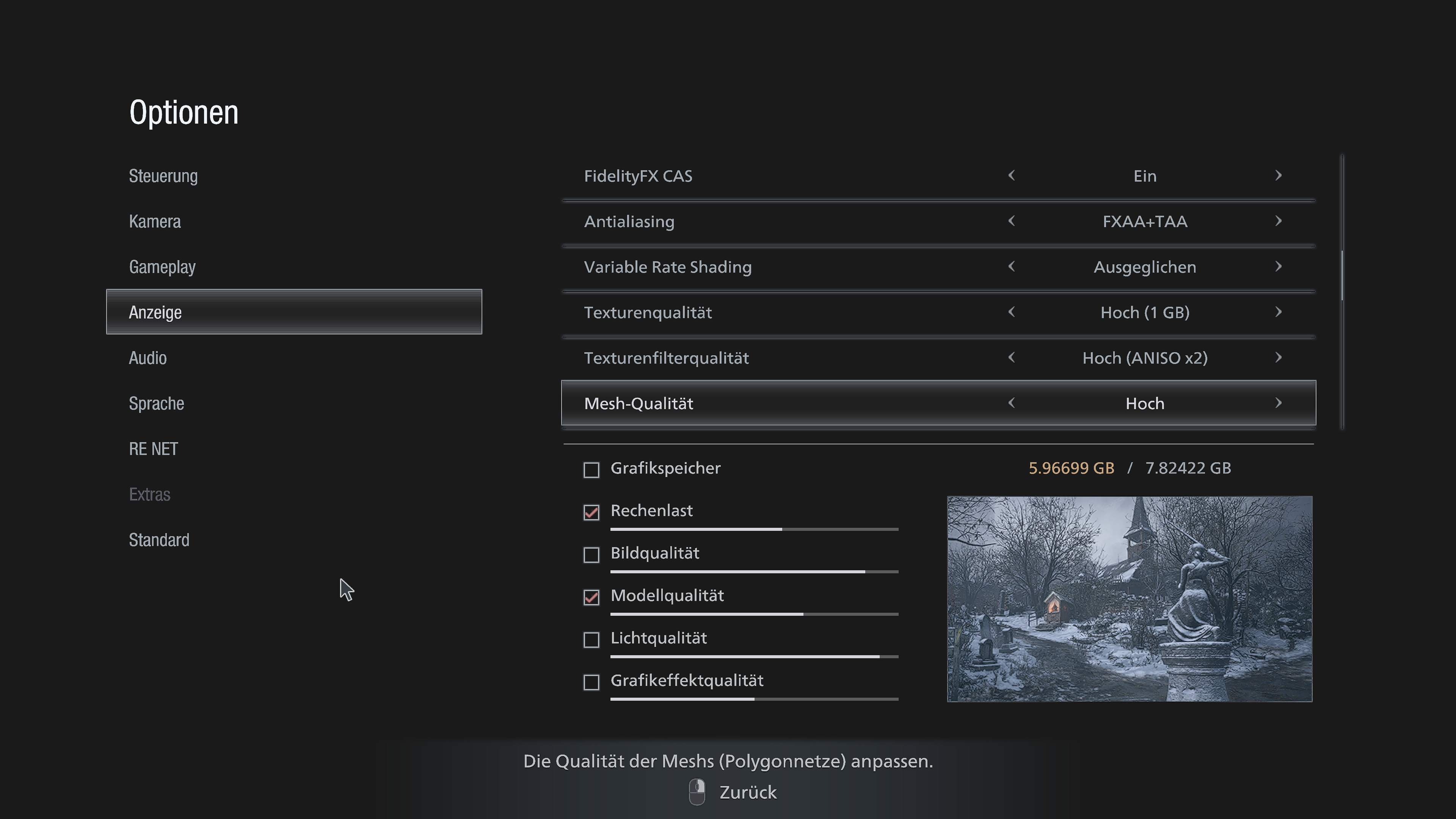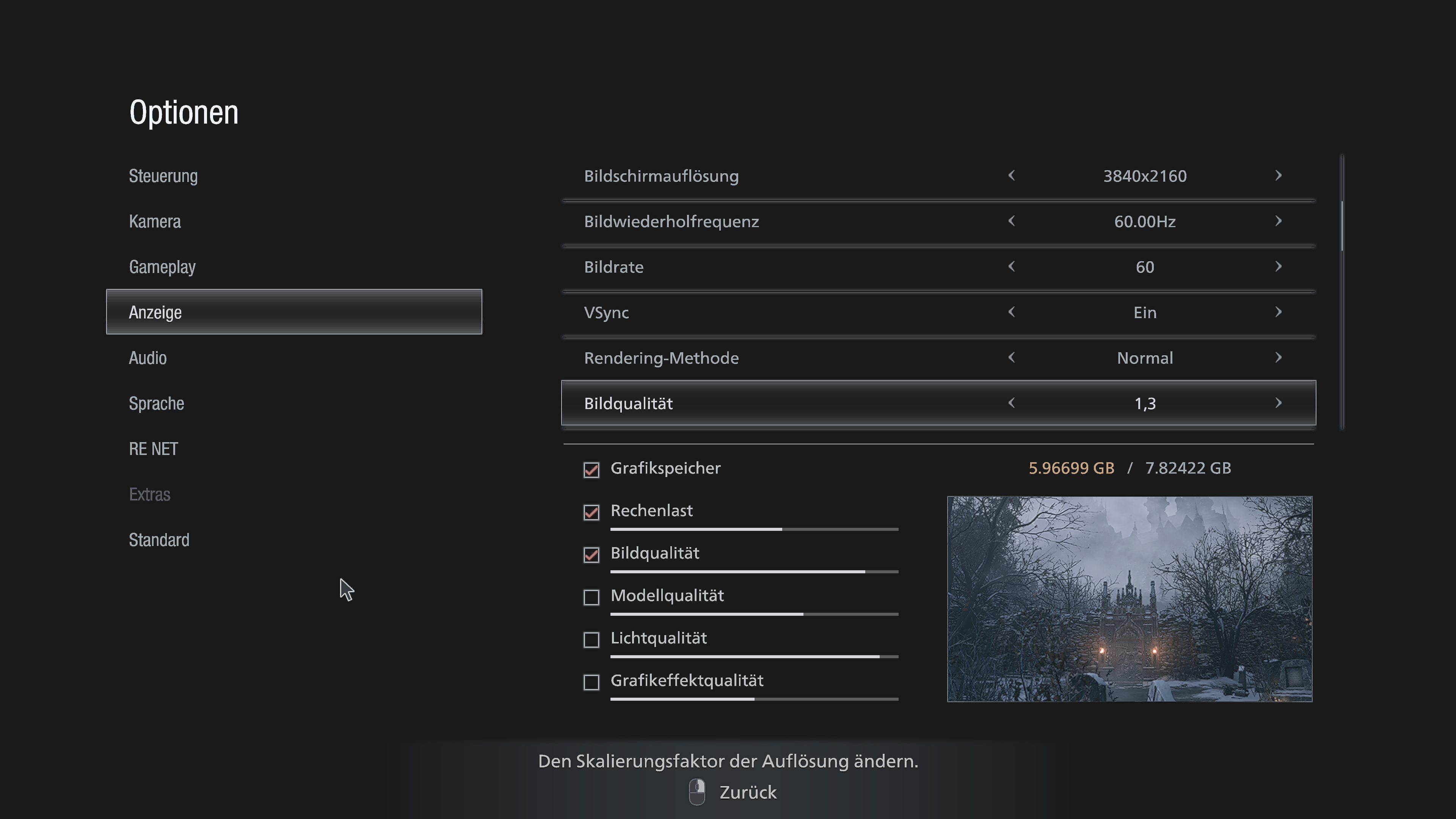 Zu meinem Problem, bei drei Spielen habe ich Grafikproblem, das sind Resident Evil: The Village, Elden Ring und ARK: Survival Evolved. Zu letzterem habe ich leider keine Screenshots, da ich es wieder von der Festplatte geschmissen habe (in der Steam Bibliothek habe ich es aber noch). Am besten sieht man es bei dem Bild von RE. Viele Oberflächen wirken wie "verpixelt" oder "gekörnt" (weiß nicht so recht wie ich das nennen soll. Beim Gamplay erscheinen dann auch öfter wie helle Lichtreflexe, die über den Bildschirm wandern. In den Game Menüs ist die Grafik normal, also gut.