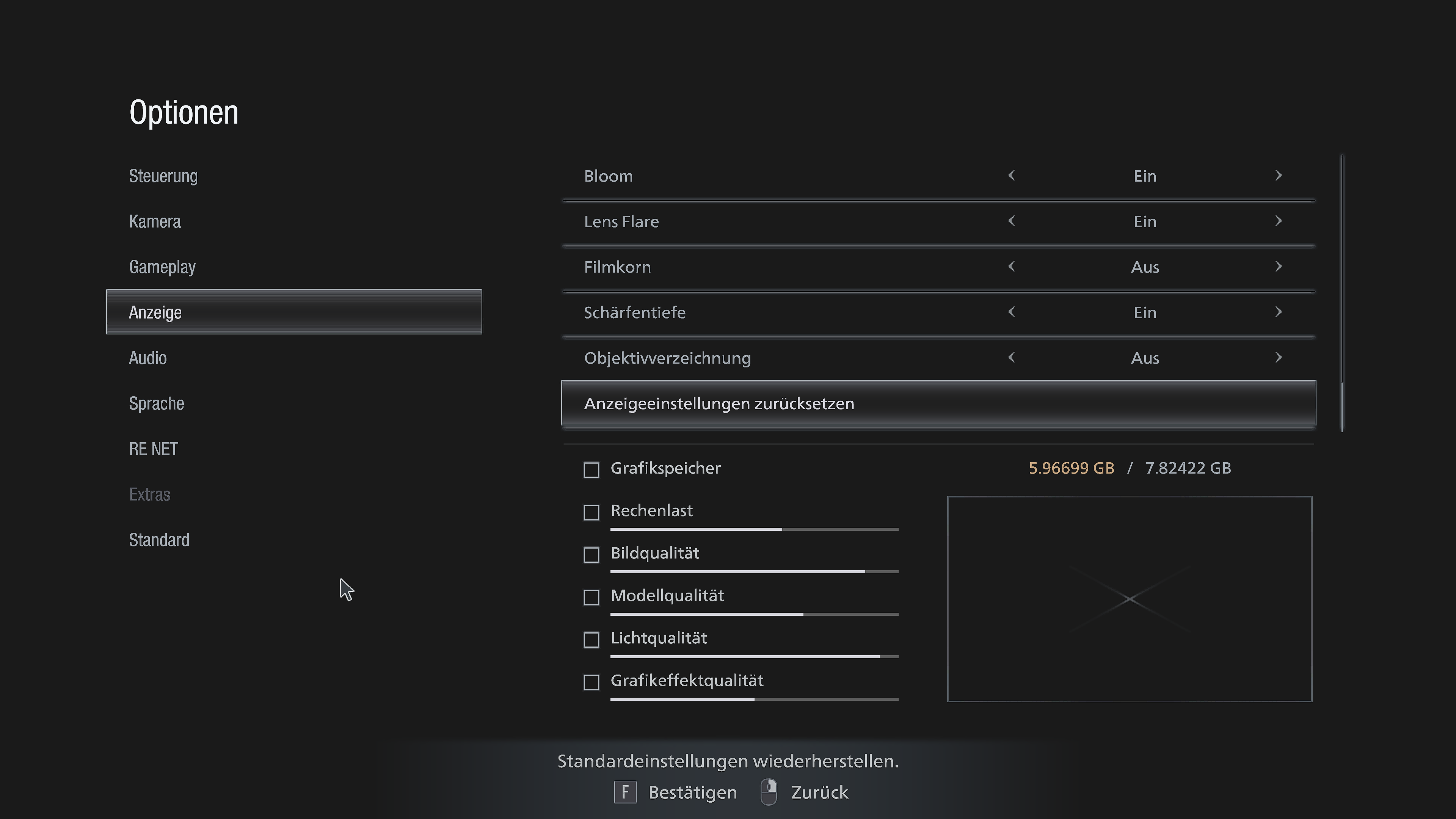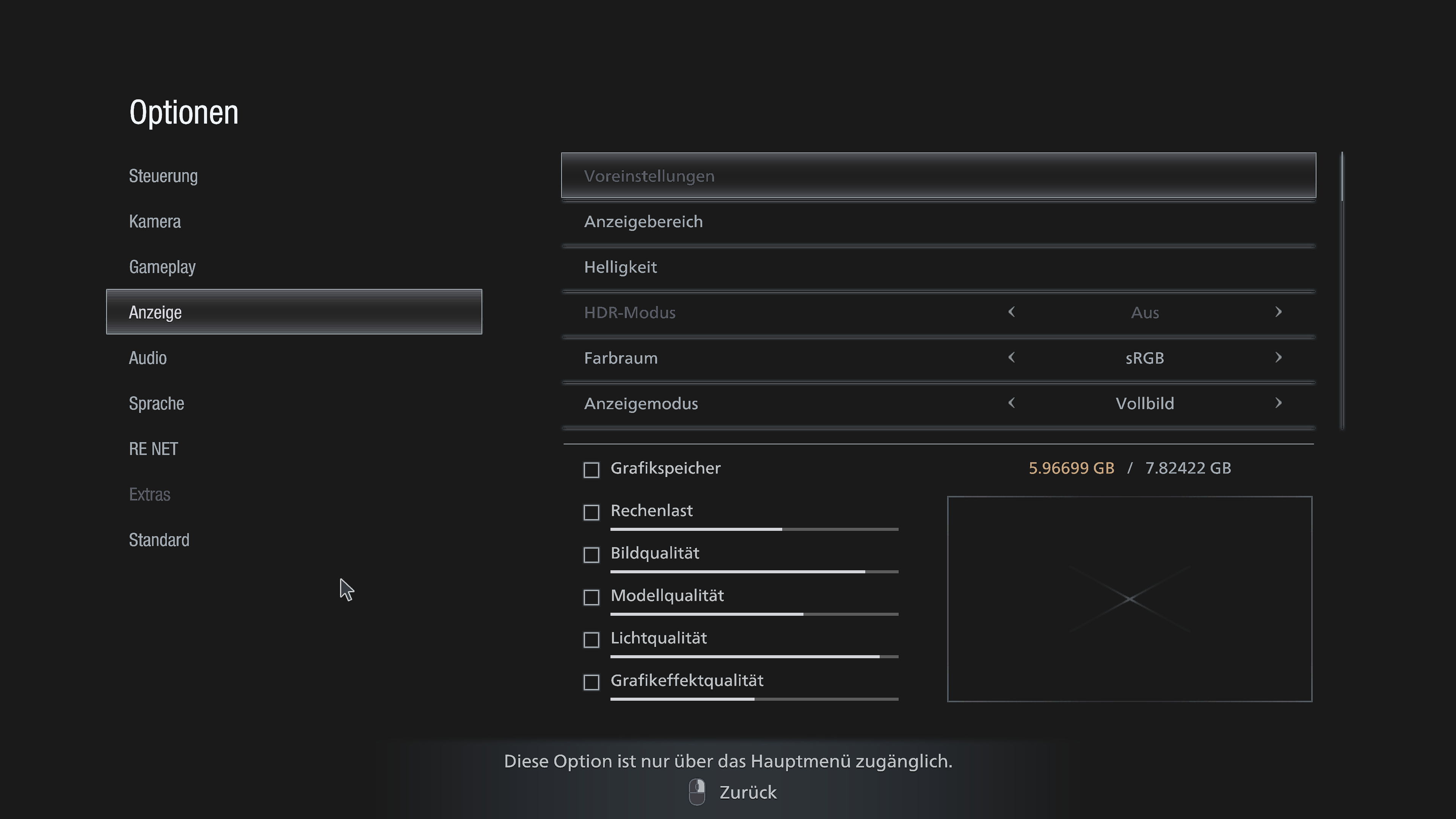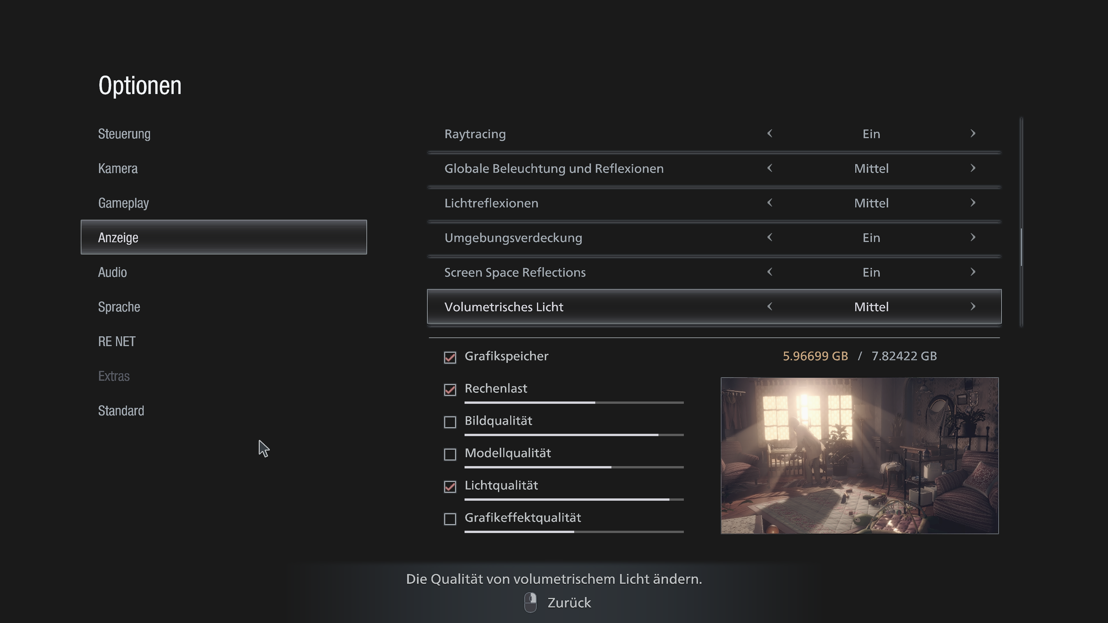 Zu meinem Problem, bei drei Spielen habe ich Grafikproblem, das sind Resident Evil: The Village, Elden Ring und ARK: Survival Evolved. Zu letzterem habe ich leider keine Screenshots, da ich es wieder von der Festplatte geschmissen habe (in der Steam Bibliothek habe ich es aber noch). Am besten sieht man es bei dem Bild von RE. Viele Oberflächen wirken wie "verpixelt" oder "gekörnt" (weiß nicht so recht wie ich das nennen soll. Beim Gamplay erscheinen dann auch öfter wie helle Lichtreflexe, die über den Bildschirm wandern. In den Game Menüs ist die Grafik normal, also gut.