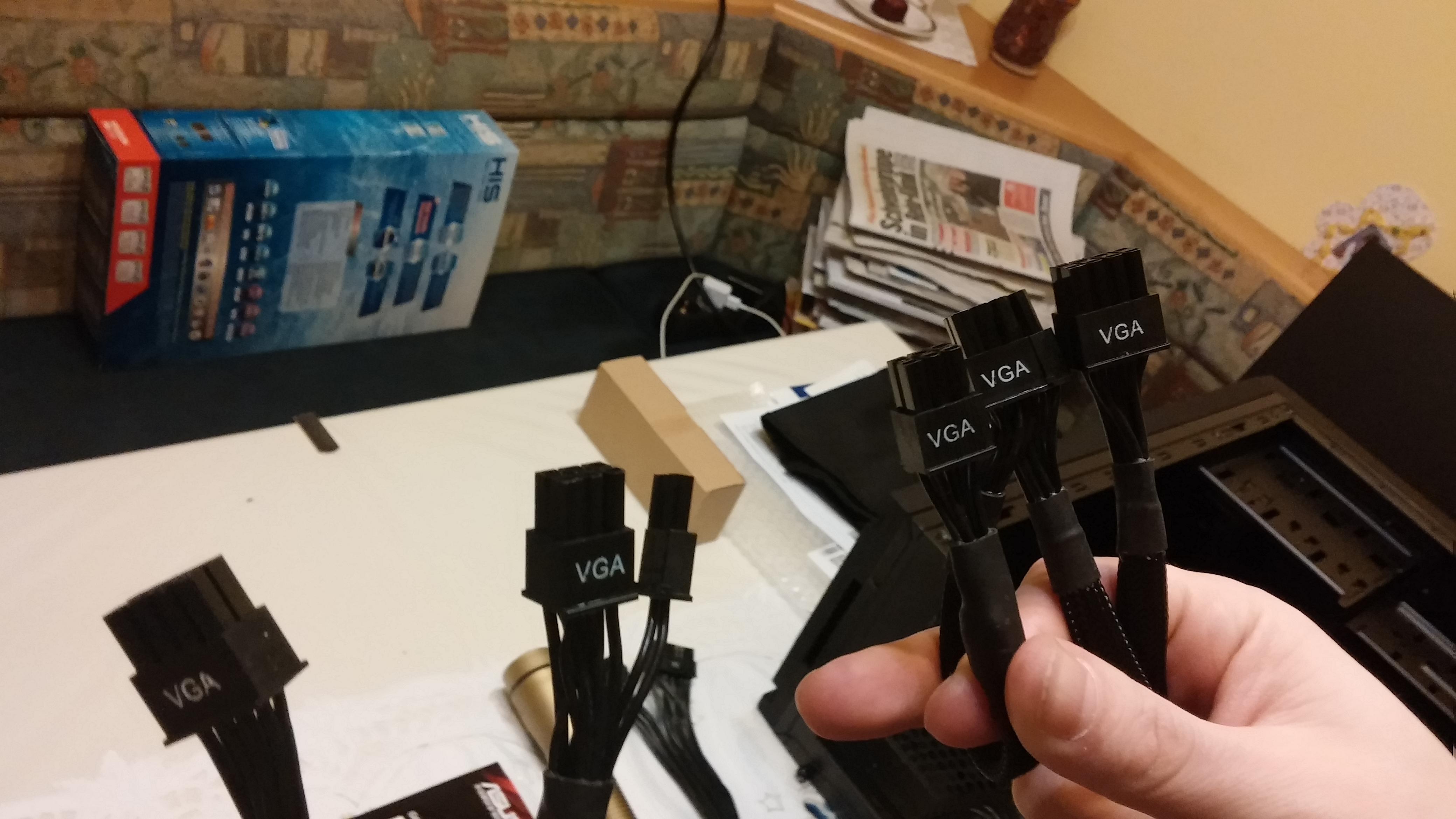 1. Normalerweise gibt es vom Netzteil (Das Netzteil ist ein EVGO Supernova 550 G2) ein PCI-E Stromkabel zur Grafikkarte (Radeon R9 390 Ice Q X2). Bei meinem Netzteil sind aber 2 VGA Kabel dabei. Sind die für die Stromversorgung zu verwenden?
