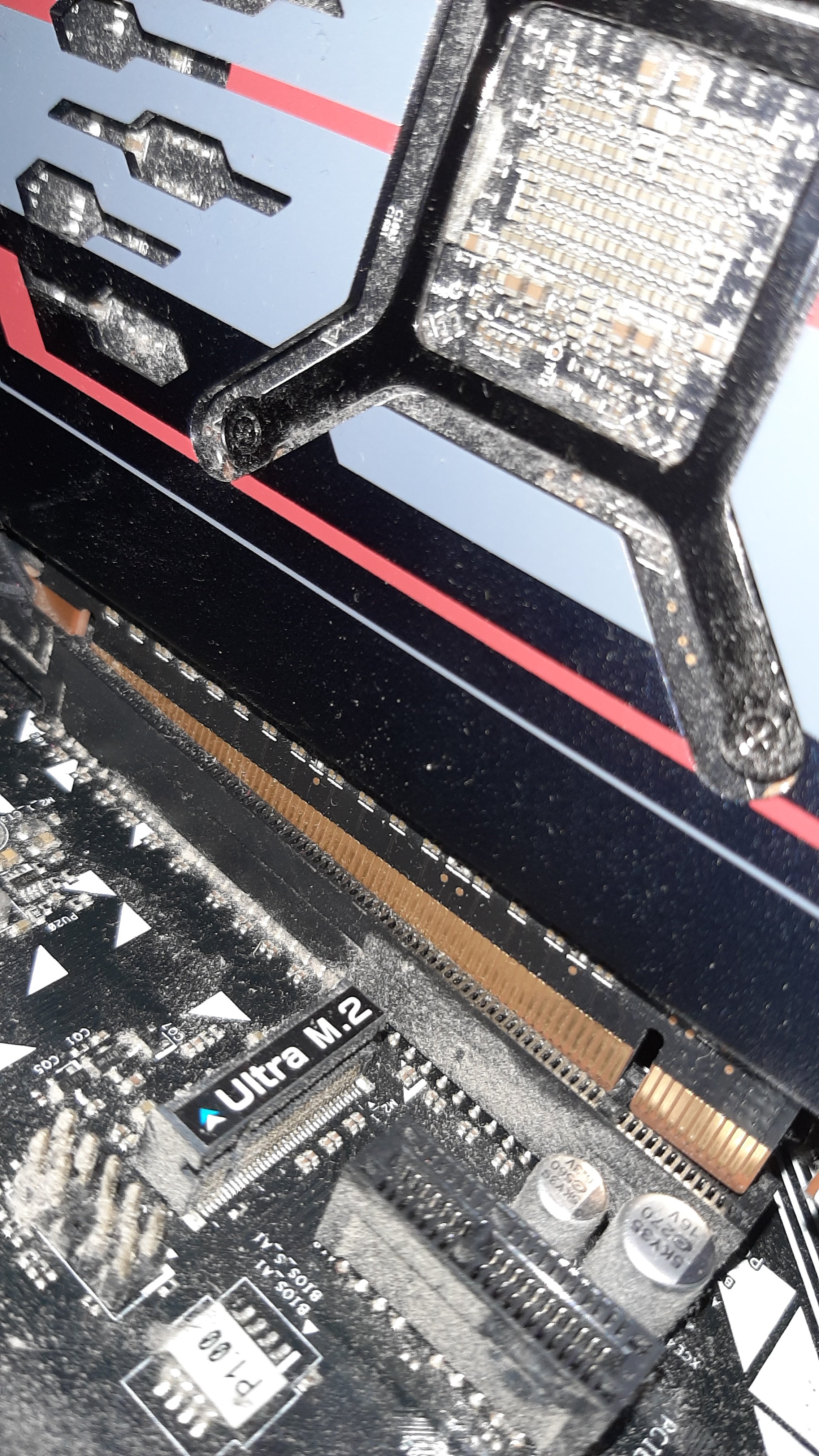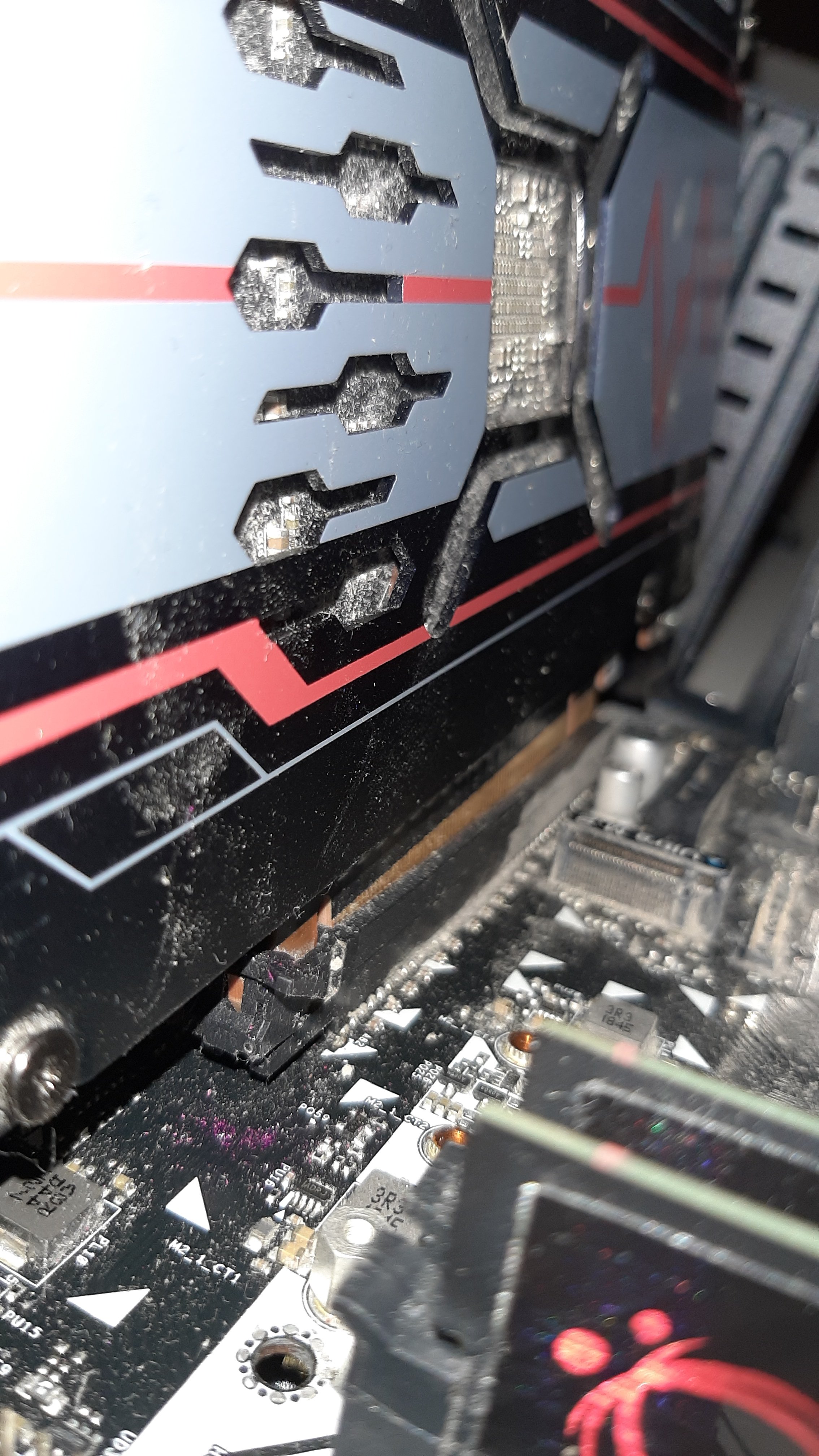 Das die Karte nicht so leicht wieder rein geht, ist mir schon klar. Das kann sein, weil die Slotblende stört. Das die Karte nicht so richtig gerade wird. Ruckelst du an der Karte, verkantet das Slotblech zwischen Gehäuse und Mainboard. Das untere Ende vom Slotblech der Karte muss ja genau in den kleinen Spalt zwischen Mainboard / Gehäuse. Vieleicht da mal drücken, das es passt. Dann sollte die Karte eben auch wieder korrekt und gerade im PCIe Slot stecken.