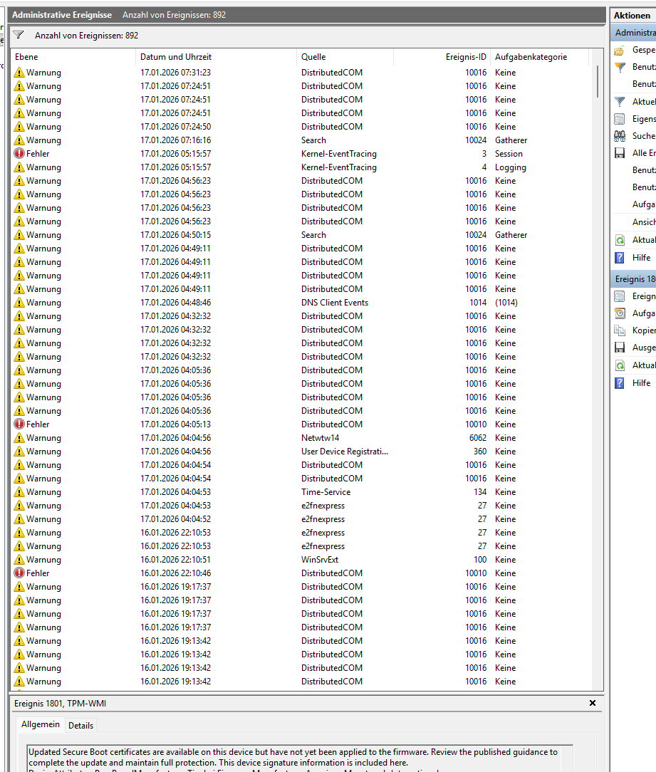 Lediglich die Fehler und Warnungen zu DistributedCOM kann man getrost ignorieren, da bisher keine Endlösung dazu exisitiert und alle Nutzer von Windows 10 und auch 11 betreffen.