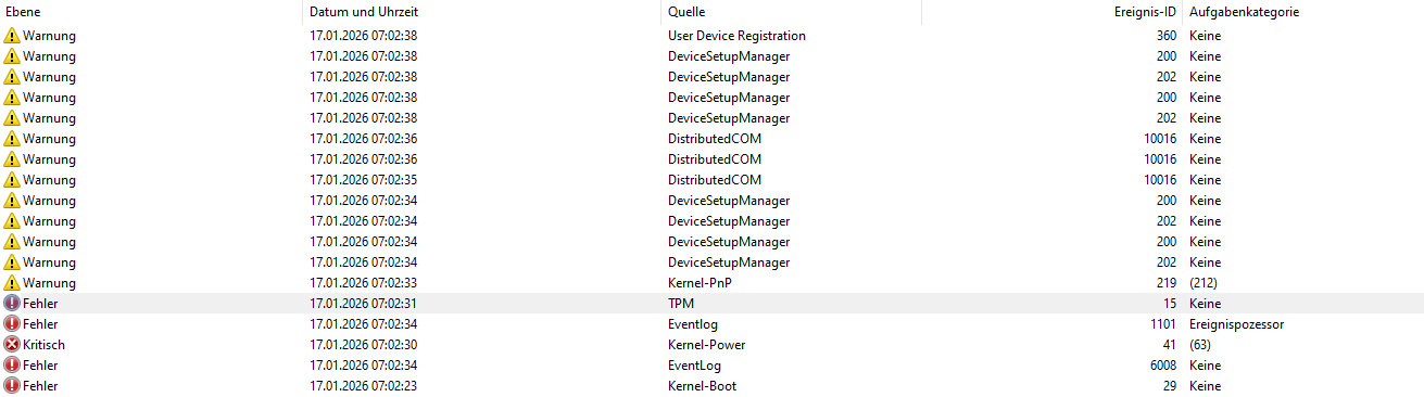 Hallo ihr Lieben. Ich habe schon seit längerer Zeit beim Booten viele Errors beim Windows Ereignisprotokoll und weiß nicht wie ich diese beheben kann. Ich habe bereits Chatgpt gefragt was man tun kann wenn man die und die Errors hat und habe auch alles probiert was da stand um die Sache zu beheben aber nichts hat geklappt. Ich hänge ein Bild an von den Errors die ich beim Booten kriege. Das war frisch nach dem BIOS Update. Hoffe jemand von euch kann mir helfen.
