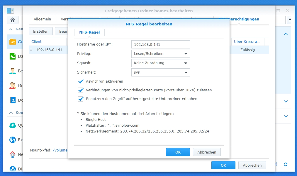 ich habe eine Synology DS218+ im Einsatz und möchte gerne die dort liegenden Filme unter Kodi einbinden. Dazu bin ich gemäß dieser Anleitung vorgegangen und habe den NFS Dienst aktiviert, sowie die IP-Adresse des Chromecast TV auf dem Kodi läuft entsprechend berechtigt siehe Screenshot: