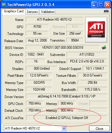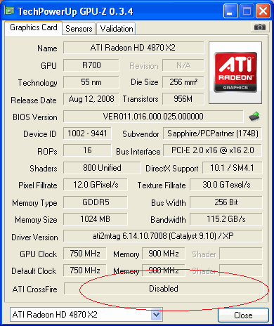 Anschließend neues CCC mit Treiber installiert und den Rechner neugestartet. Als erstes meldet der CCC das Crossfire aktiviert ist (bei einer 4870 X2 ist Crossfire nicht aktiviert, da die beiden GPU ja intern verbunden sind). So weit so gut.