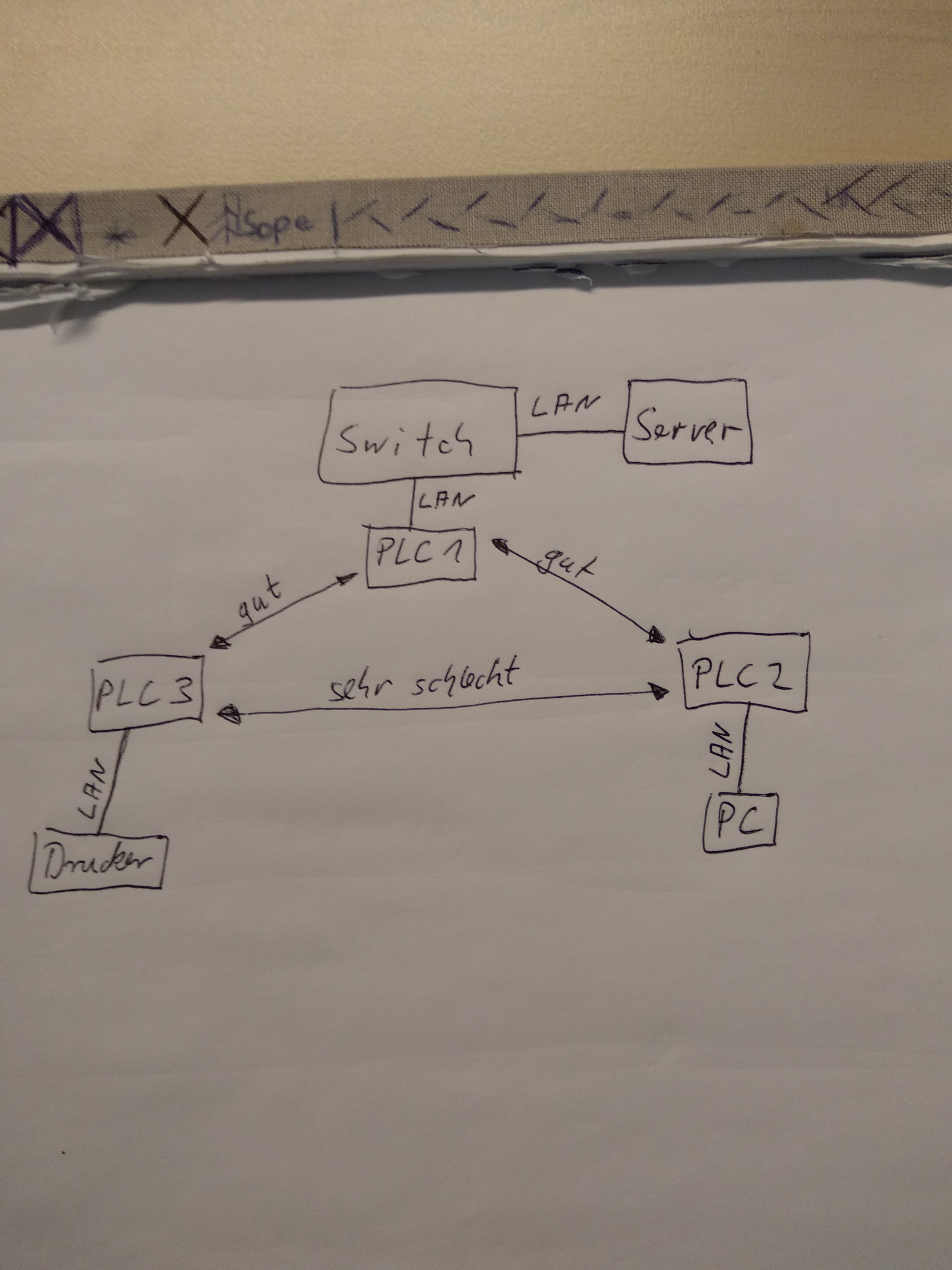 Anscheinend wollen PLC2 und 3 direkt miteinander kommunizieren wenn der PC auf den Drucker zugreift, evtl. wird ein MAC-Table verwendet ähnlich wie bei einem Switch...?