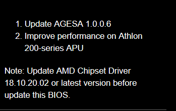 "Note: Update AMD Chipset Driver 18.10.20.02 or latest version before update this BIOS."