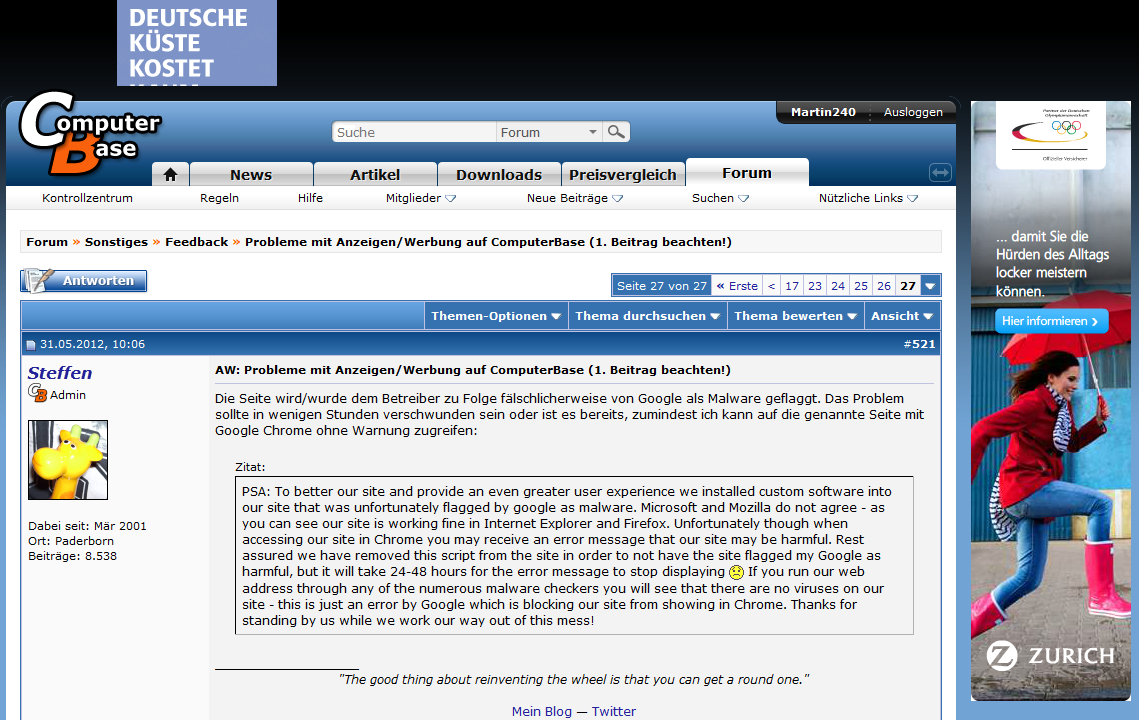 Die Seite wird/wurde dem Betreiber zu Folge fälschlicherweise von Google als Malware geflaggt. Das Problem sollte in wenigen Stunden verschwunden sein oder ist es bereits, zumindest ich kann auf die genannte Seite mit Google Chrome ohne Warnung zugreifen: