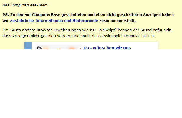 Wir erwähnen jetzt im Hinweis-Text auch NoScript als mögliche Ursache dafür, dass das Gewinnspiel-Formular nicht angezeigt wird!Console Cowboy schrieb:zum 14-Jahre-Gewinnspiel wird dennoch kein Teilnahmeformular angezeigt-