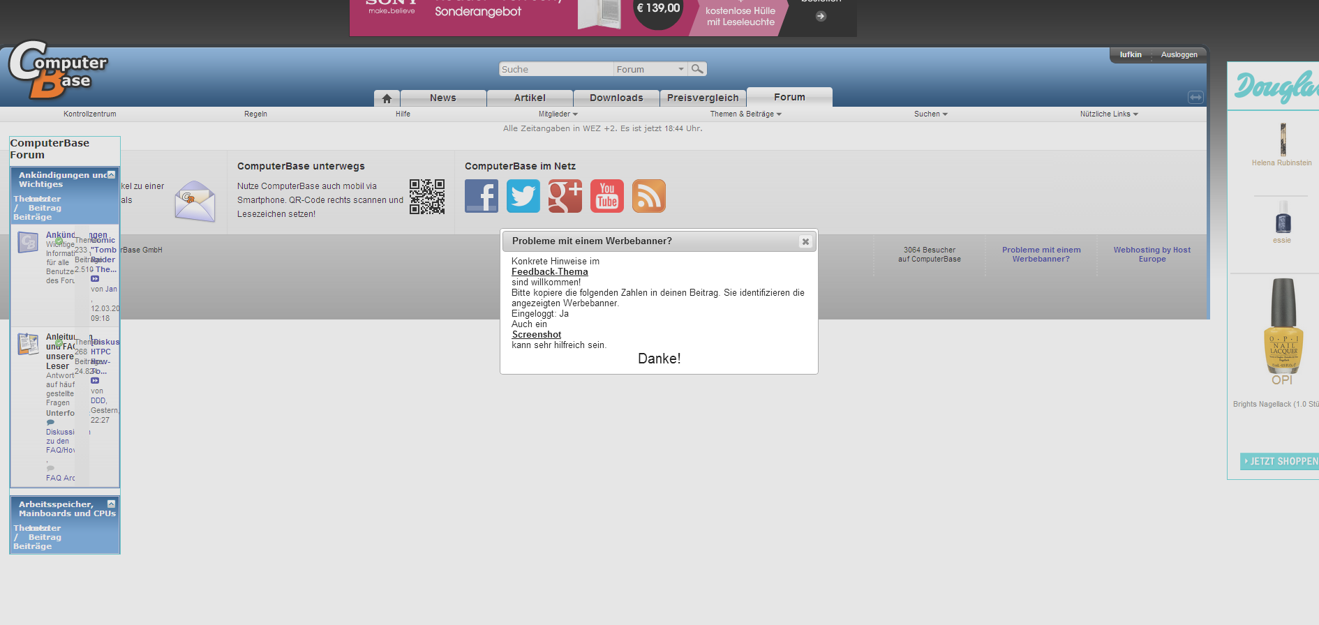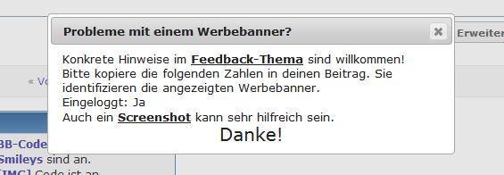 Gerne hätte ich den "Probleme mit dem Werbebanner?" Link genutzt, doch in dem Feld (hat alleine zwei Minuten gedauert bis es offen war) stand nur "Bitte kopiere die folgenden Zahlen in deinen Beitrag.", aber keine Nummer.