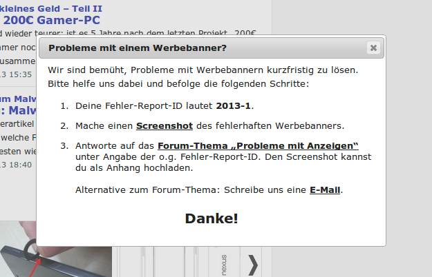 Die IDs gibt es seit einer Ad-Server-Umstellung bei unserem Vermarkter leider nicht mehr. Deshalb müssen wir jetzt mit Screenshots arbeiten.1337 g33k schrieb:Noch was anderes: Wenn ich auf "Probleme mit einem Werbebanner?" klicke erscheinen keine IDs mehr.