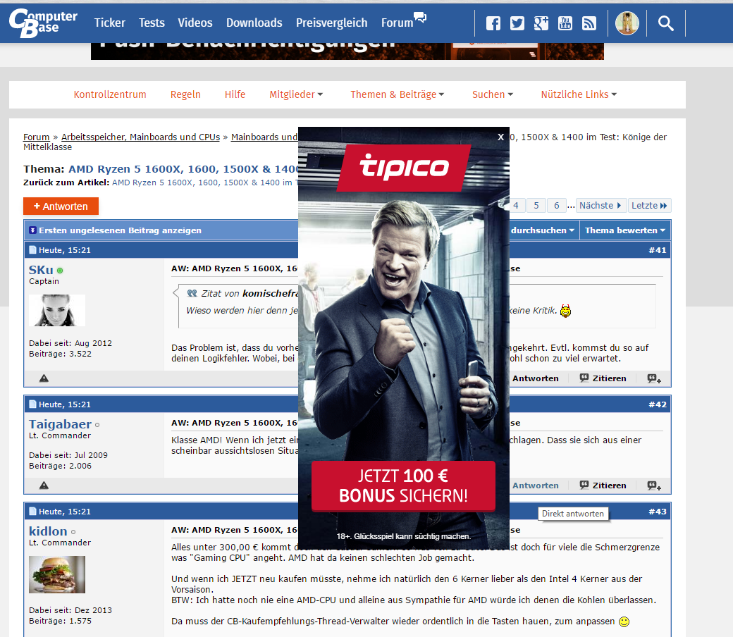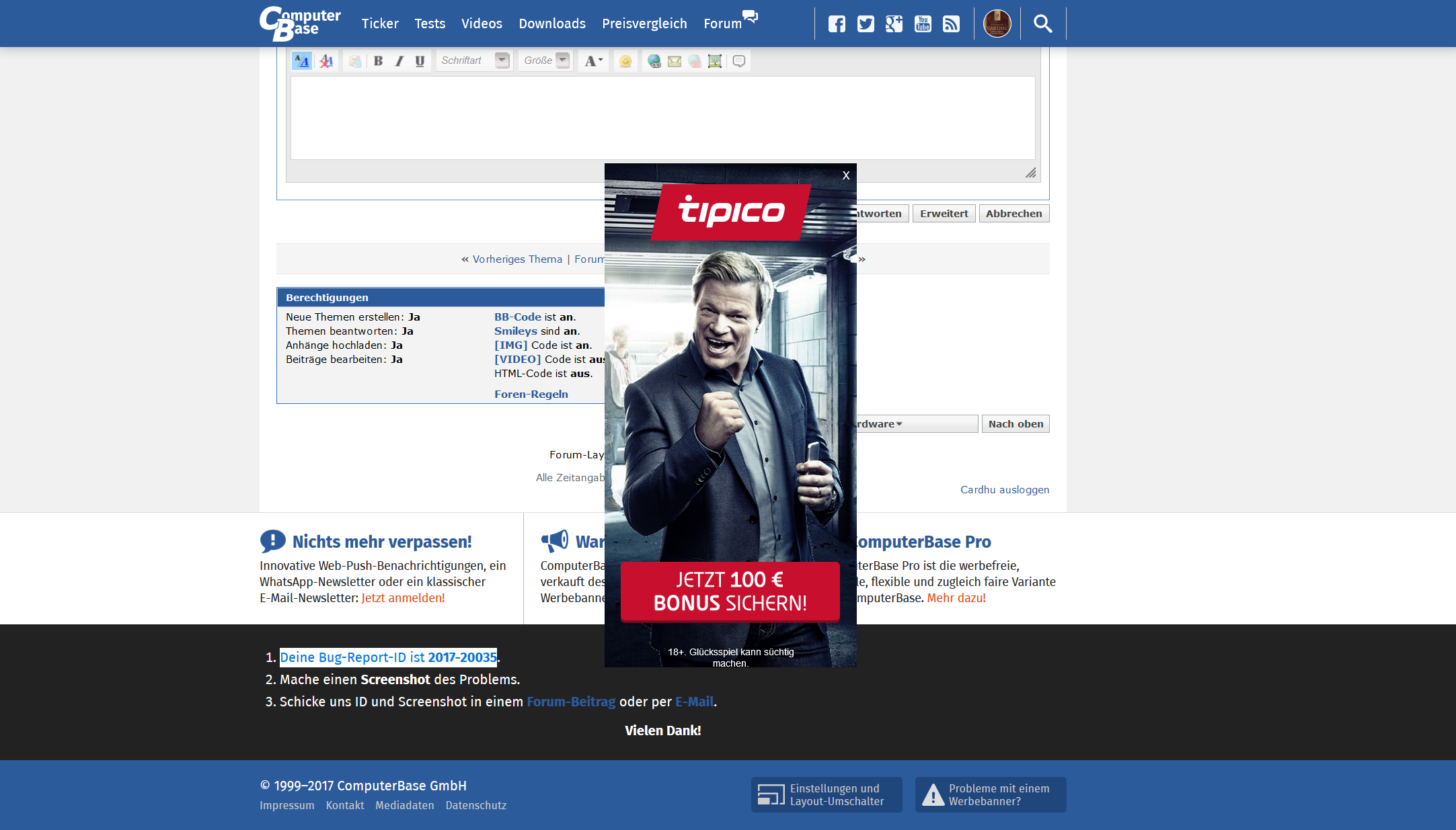 Steffen schrieb:Im Footer jeder Seite (der blaue Bereich unten am Seitenende) gibt es einen dunkelblauen Button „Probleme mit einem Werbebanner?“. Wichtig ist, dass man diesen Button auf derjenigen Seite anklickt, auf der das Problem aufgetreten ist. Denn bei Klick auf den Button werden Daten über die angezeigten Werbebanner und ein paar technische Details (URL der Seite, verwendeter Browser und Viewport-Größe) gespeichert, die uns bzw. unserem Vermarkter bei der Fehlersuche helfen. Bitte meldet euch dann mit der generierten Bug-Report-ID und einem Screenshot hier in diesem Thema