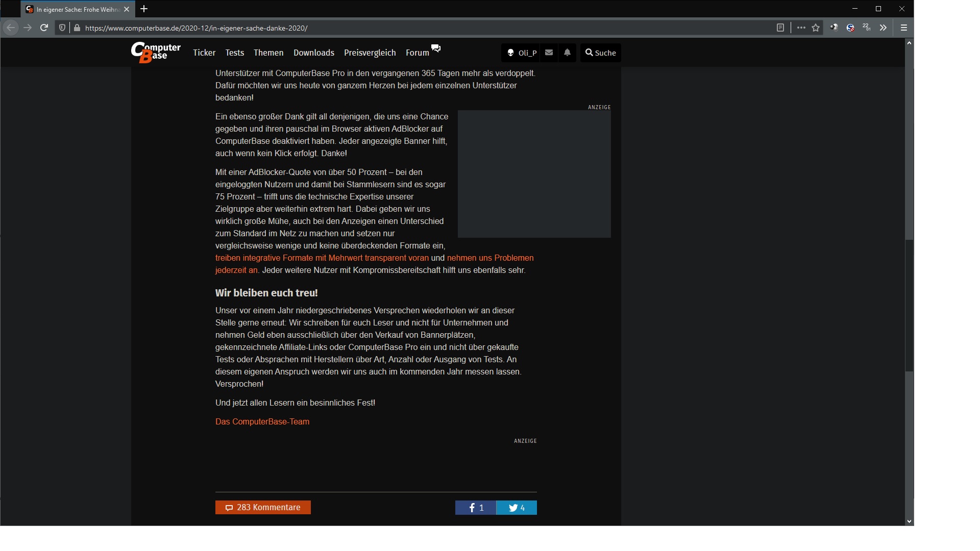Per default ist der Trackingschutz afaik nur im privaten Modus an.Oli_P schrieb:Okay, selbst wenn ich nicht Noscript am laufen hätte bzw. Noscript ausschalten würde dann würde Firefox das laden der Werbung verhindern. Aber Firefox ist standardmäßig so eingestellt? Eigentlich fragt ihr ja nicht nur, den Adblocker auszuschalten. Eigentlich muss man noch mehr Dinge ausschalten um eurem Anliegen näher zu kommen.