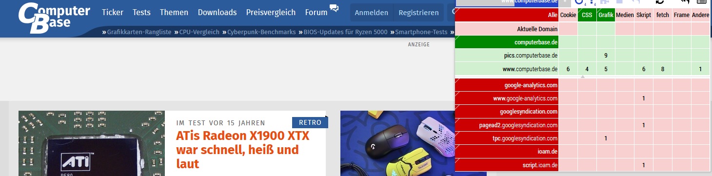 Dass nur ein paar blockierte Google-Tracker angezeigt werden, wie du in dem anderen Thread gesagt hast und wie man es hier im Screenshot sieht, liegt daran, dass unser Ad-Script gar nicht erst weiter herumprobiert andere Ad-Server zu kontaktieren, wenn schon der Kontakt zu den Google-Ad-Servern blockiert wird.