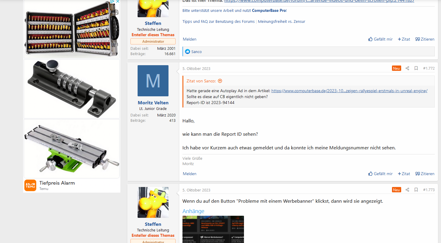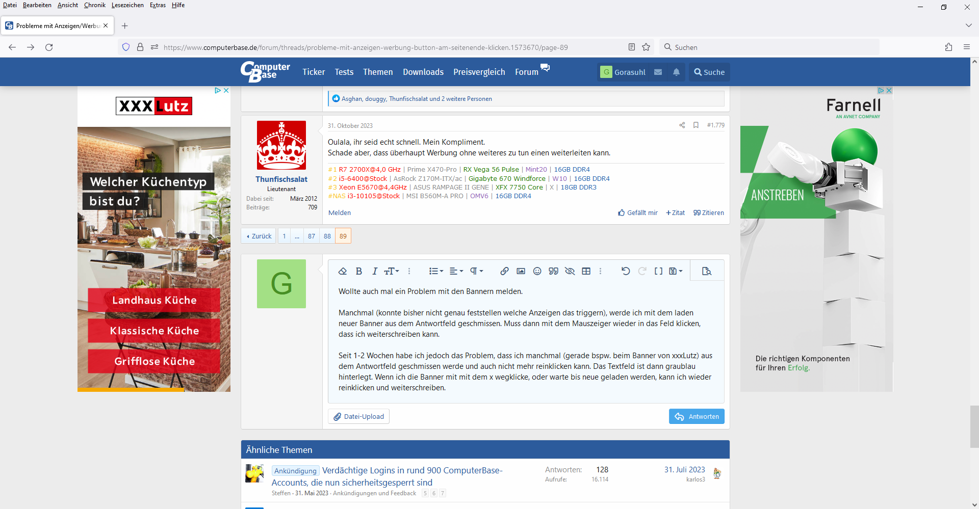 Manchmal (konnte bisher nicht genau feststellen welche Anzeigen das triggern), werde ich mit dem laden neuer Banner aus dem Antwortfeld geschmissen. Muss dann mit dem Mauszeiger wieder in das Feld klicken, dass ich weiterschreiben kann.