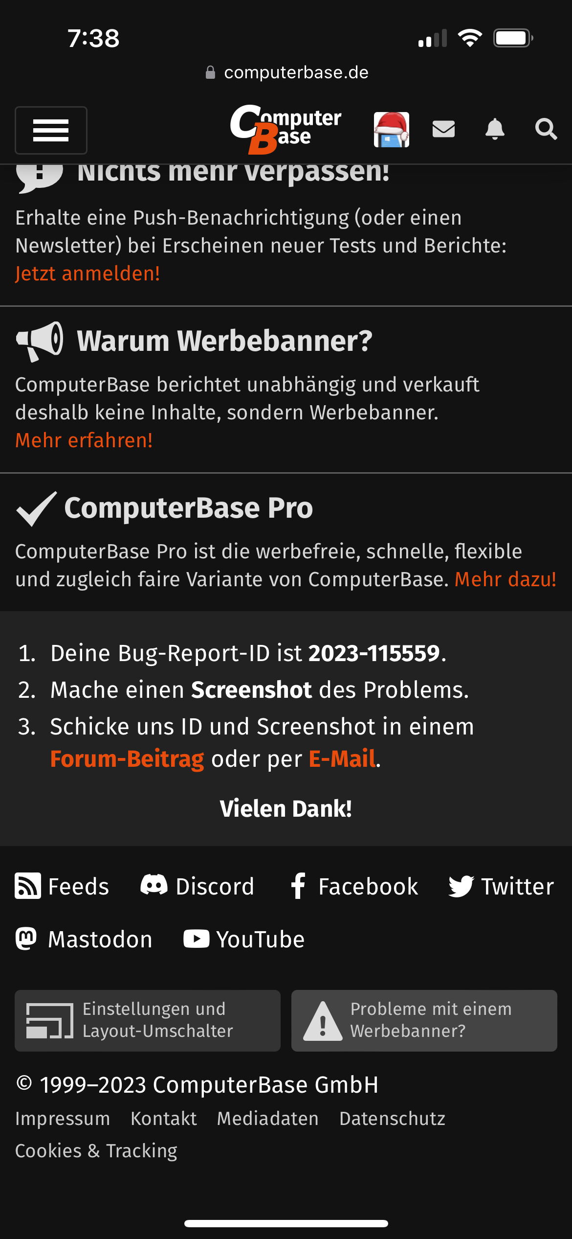 @Picknatari Ohne Bug-Report ID tut sich Steffen meist schwerSteffen schrieb:Das Wichtigste in Kürze: Wenn es auf ComputerBase Probleme mit einem Werbebanner gibt, dann klicke auf der jeweiligen Seite bitte im Footer (der blaue Bereich unten am Seitenende) auf den dunkelblauen Button „Probleme mit einem Werbebanner?“ und folge den Anweisungen. So können wir bzw. unser Vermarkter dem Problem effektiv nachgehen. Vielen Dank!![]()