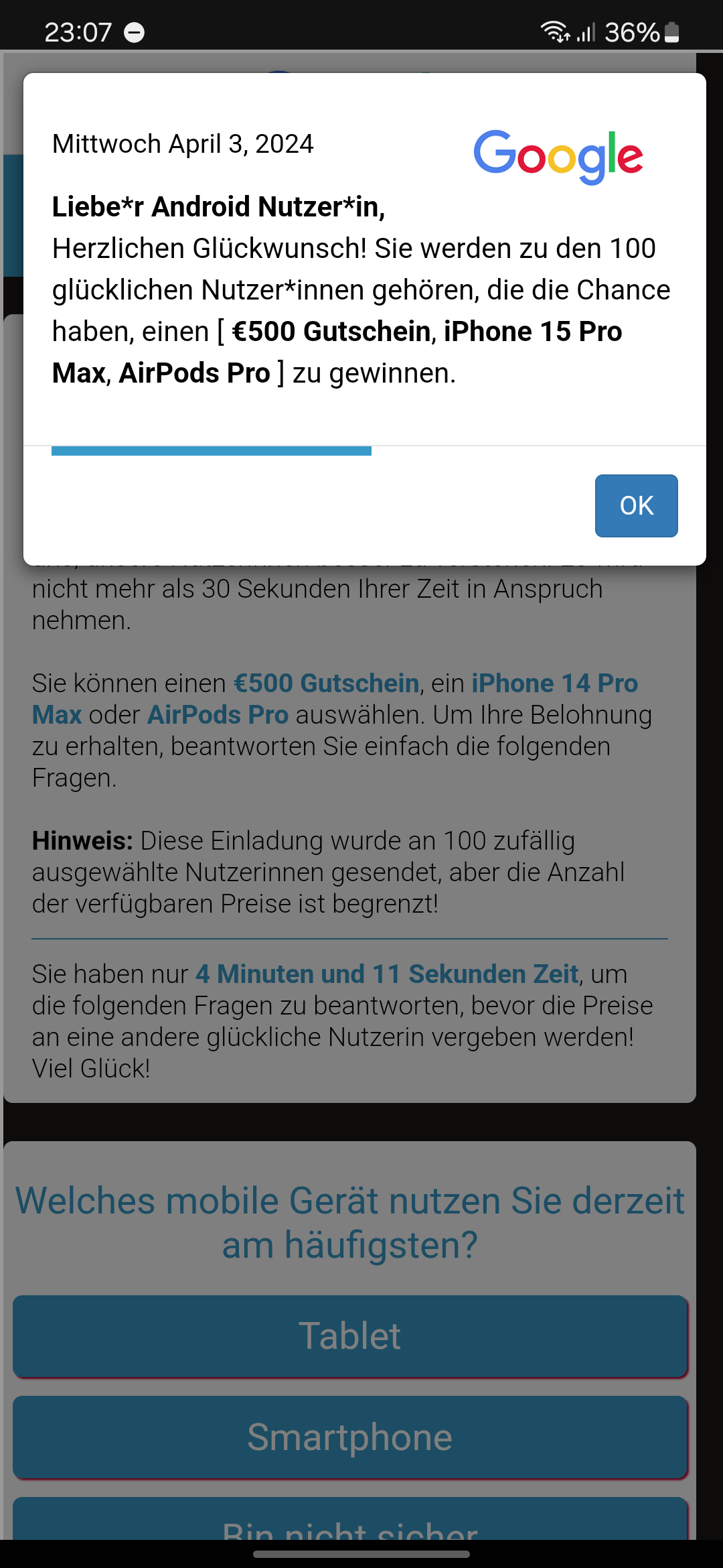 Kam gerade bei mir, als ich auf der Startseite war. Leider nicht möglich auf "Probleme mit Werbebanner" zu klicken, da PWA App und die Seite gewechselt wird.