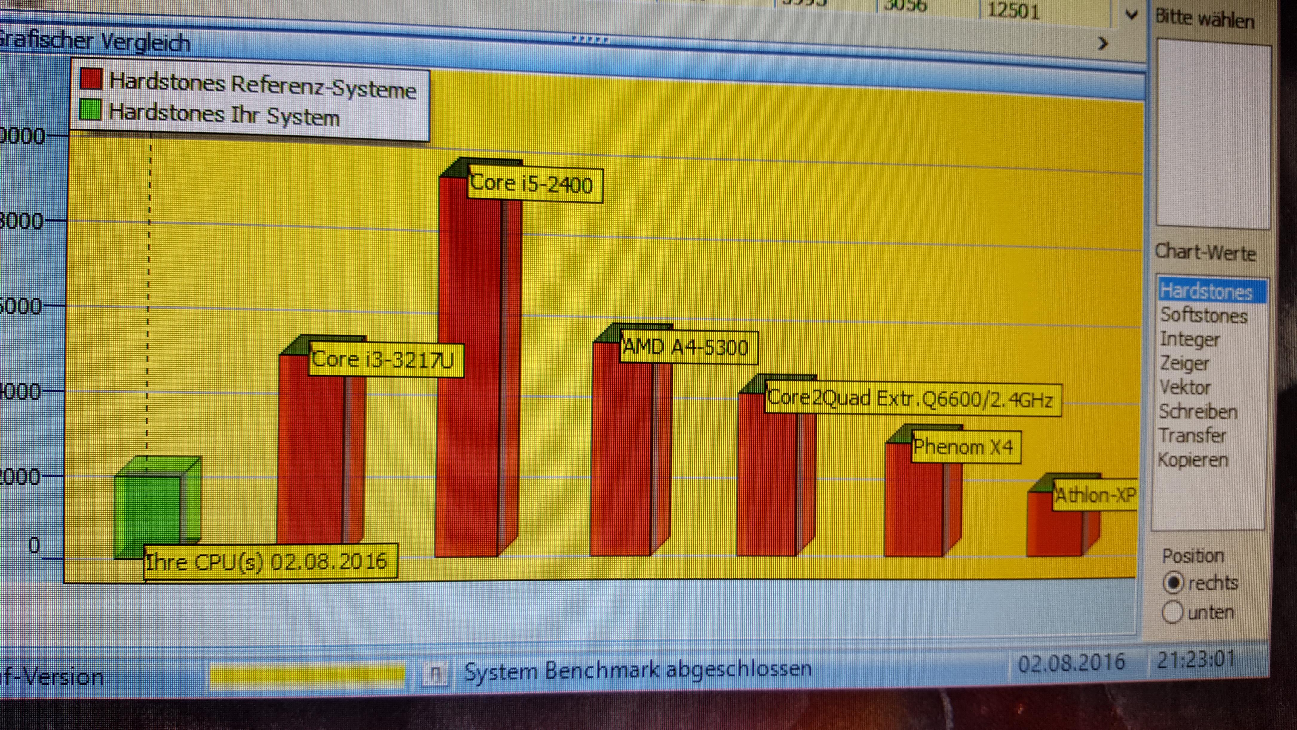Dann kurze Zeit später hab ich weitere Probleme gemerkt, weil ich beim zocken zum Beispiel anstatt konstante 70fps nicht mehr über 20-30 fps komme (auch wenn ich die Grafikeinstellungen komplett runter stelle). Nachdem ich dann alles mögliche ausprobiert habe und dann, weil nichts geholfen hat, den PC neu aufgesetzt habe, hat es wieder normal funktioniert für ein paar Wochen. Jetz habe ich aber wieder die selben Framedrops und laut dem Programm Dr.Hardware ist die Leistung (siehe Bilder) meines Prozessors deutlich unter der Leistung schlechtere Prozessoren. (Ich habe auch schon versucht den aktuellsten Grafiktreiber zu installieren, aber mein PC stürzt bei der installation immer ab)