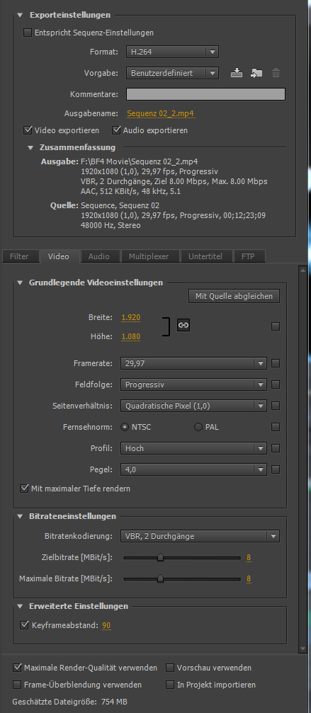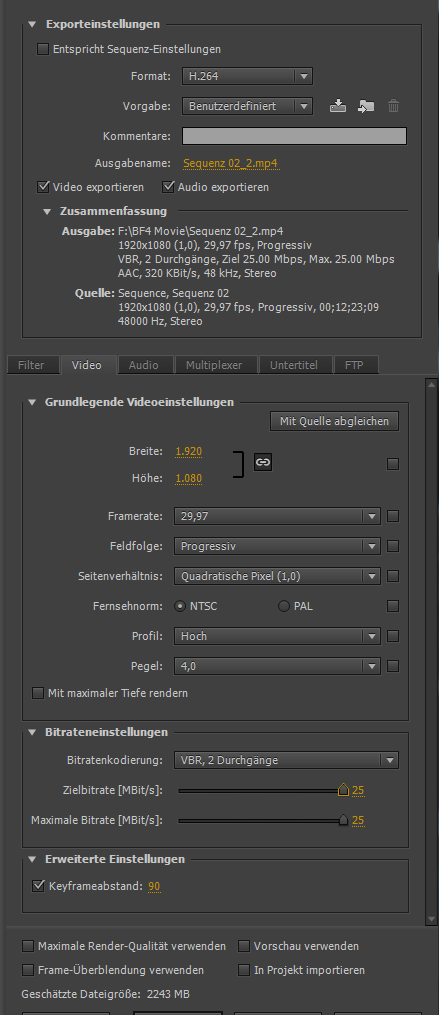 Ich habe mir gedacht, ok, habe ich halt irgendwo eine falsche Einstellung gemacht, ich habe das Material nämlich als Voreinstellung „HD1080p 29,97 FPS“ und als nicht als „YouTube HD 1080p“ ausgeben lassen. Also habe ich es nochmal mit der direkten YouTube-Vorauswahl probiert. Anfangs habe ich noch ein paar Einstellungen wie bei „HD1080p 29,97 FPS“ gemacht, z.B. auf PAL umgestellt und nicht auf NTSC wie in der Vorauswahl, außerdem natürlich die Framerate von voreingestellten 50 auf 29,97 runtergestellt, weil das Videomaterial auch nur in 30 FPS aufgenommen und die Sequenz mit 29,97 FPS erstellte wurde. Generell sahen die Einstellungen also so aus, variiert habe ich dann lediglich nur noch die Bitrateneinstellungen oder mal den Haken bei „mit maximaler Tiefe rendern“ oder „höchste Renderqualität verwenden“ rein- bzw rausgenommen: